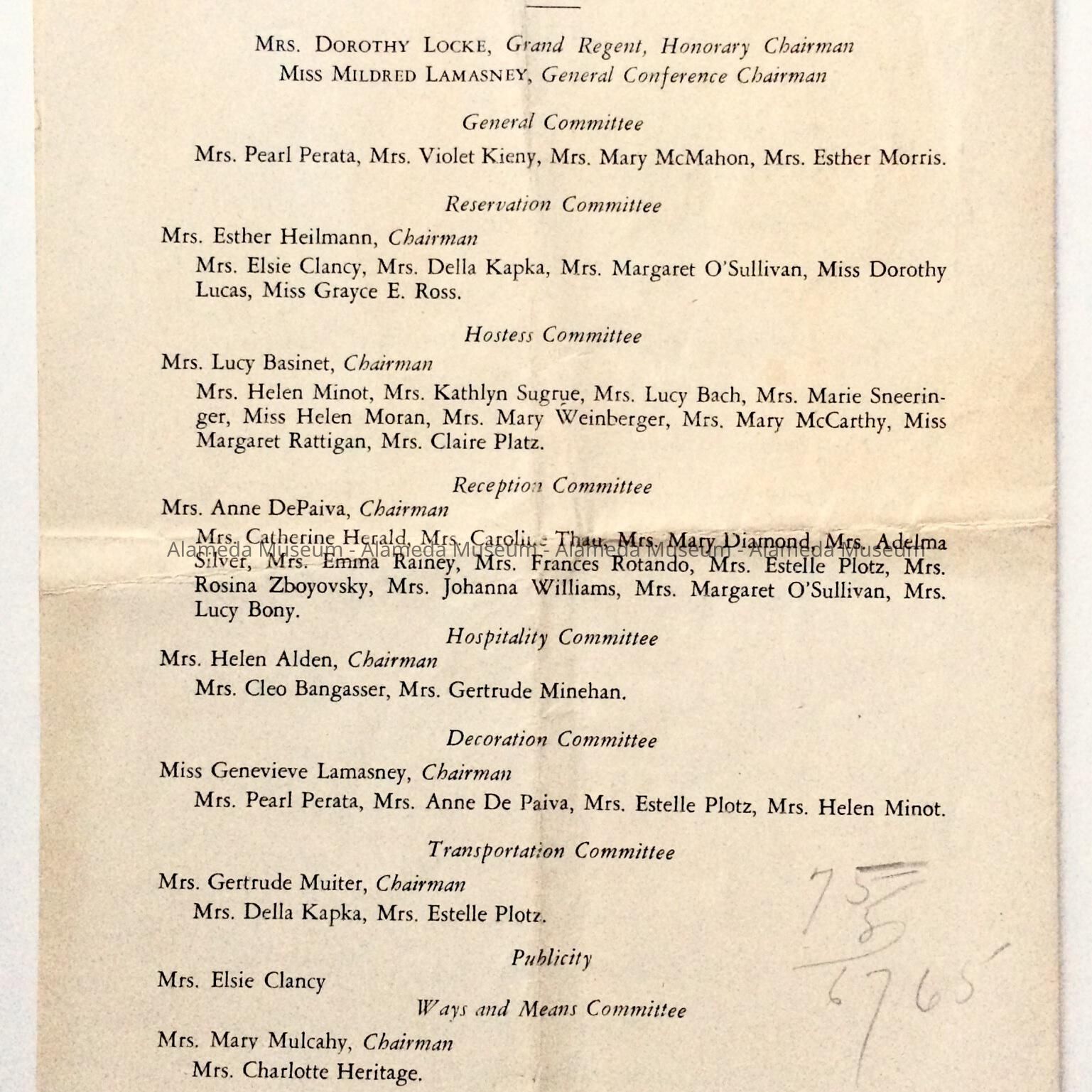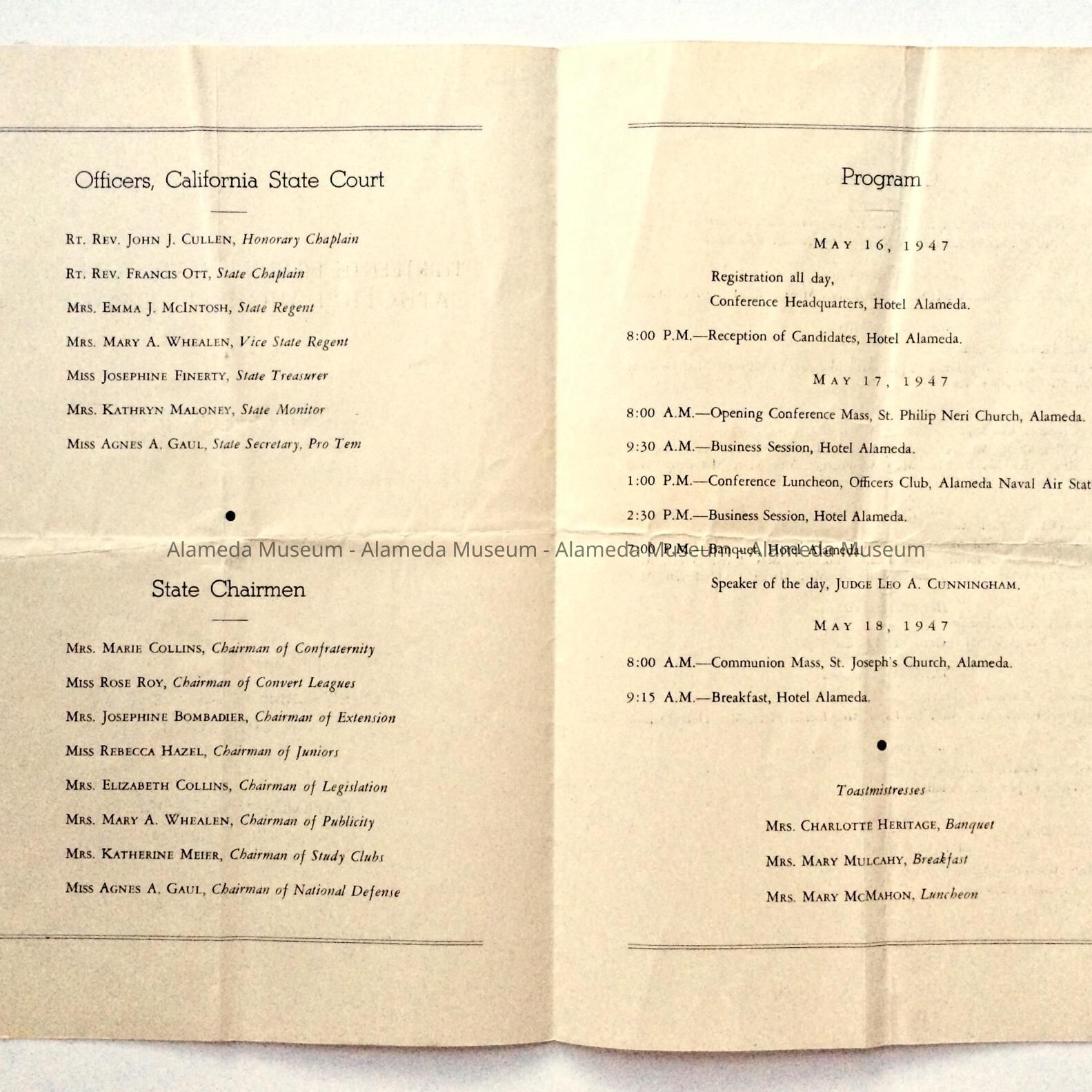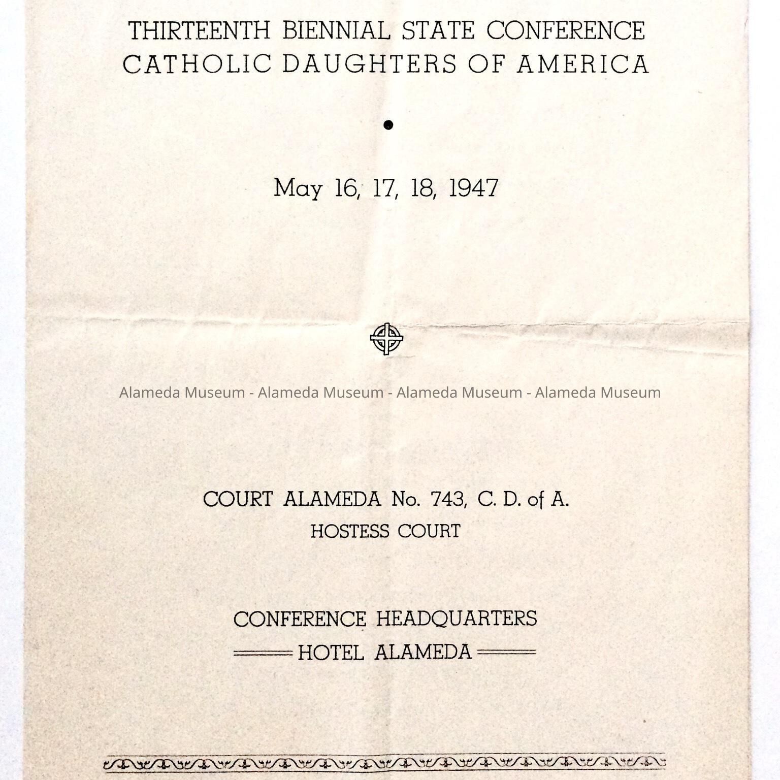 PROGRAM FOR THE CATHOLIC DAUGHTERS OF AMERICA, HELD ON MAY 16 THRU MAY 18, 1947, AT THE HOTEL ALAMEDA. A COMMUNION MASS WAS RECITED AT SAINT JOSEPH'S CATHOLIC CHURCH ON MAY 18, 1947. AMONG THE HOSTESSES WAS MRS MARIE MULCAHY, MOTHER OF THE LATE REBA STENSON.