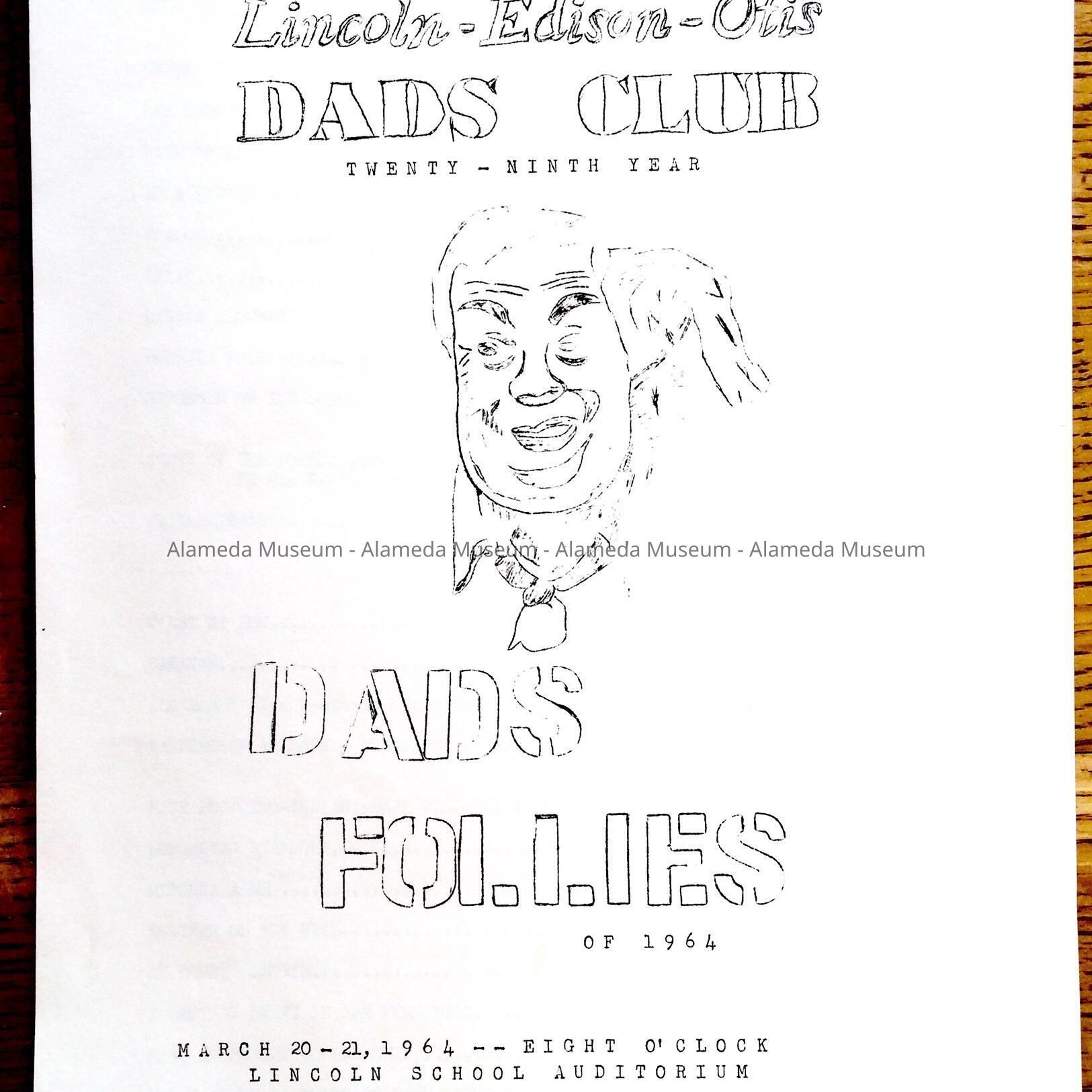 Description: staple-bound mimeographed copy of a program, with front page featuring a drawing of a face of a man wiping his temple with a cloth. Title: 'Lincoln - Edison - Otis Dads Club - Twenty-Ninth Year Dads Follies of 1964'.