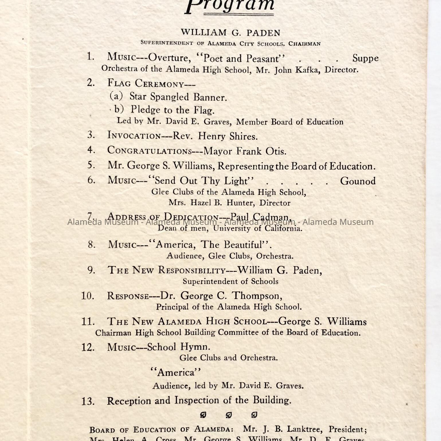 PROGRAM, DEDICATION CEREMONIES, THE NEW ALAMEDA HIGH SCHOOL, AUG 18, 1926 PROGRAM WITH LIST OF SPEAKERS AND MUSIC PERFORMED.