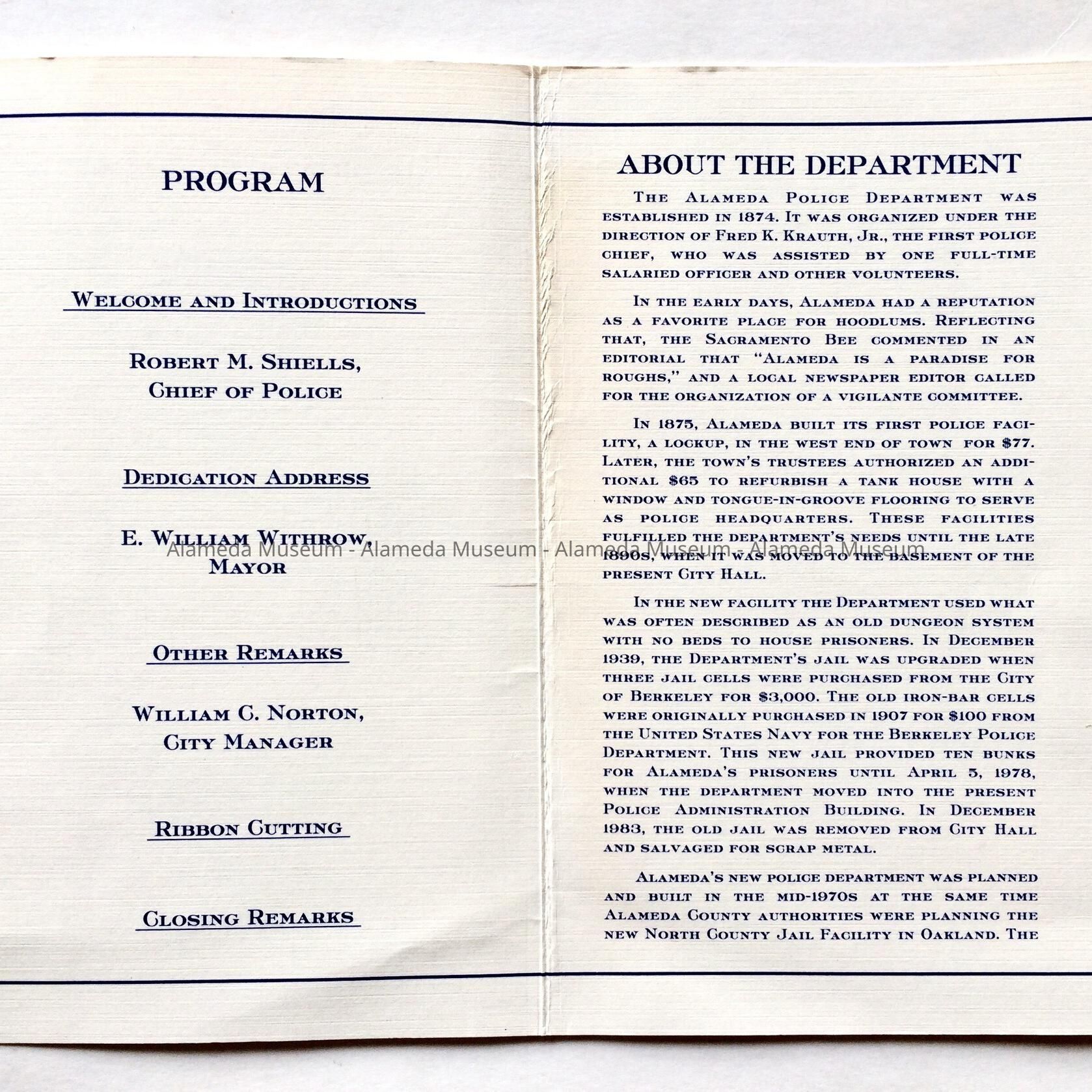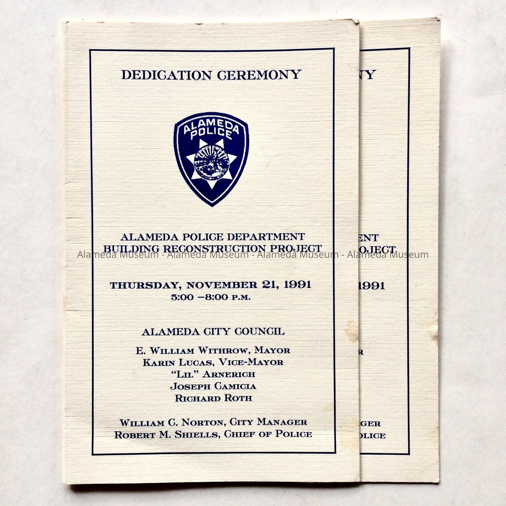 DESCRIPTION: TWO COPIES OF A 2-PAGE PROGRAM. PROGRAM'S SOFT COVER HAS A BOLD-PRINTED CAPTION, "DEDICATION CEREMONIES" AND A REPRODUCTION OF THE ALAMEDA POLICE PAGE IN BLUE-COLORED TYPE ON A WHITE-COLORED BACKGROUND.