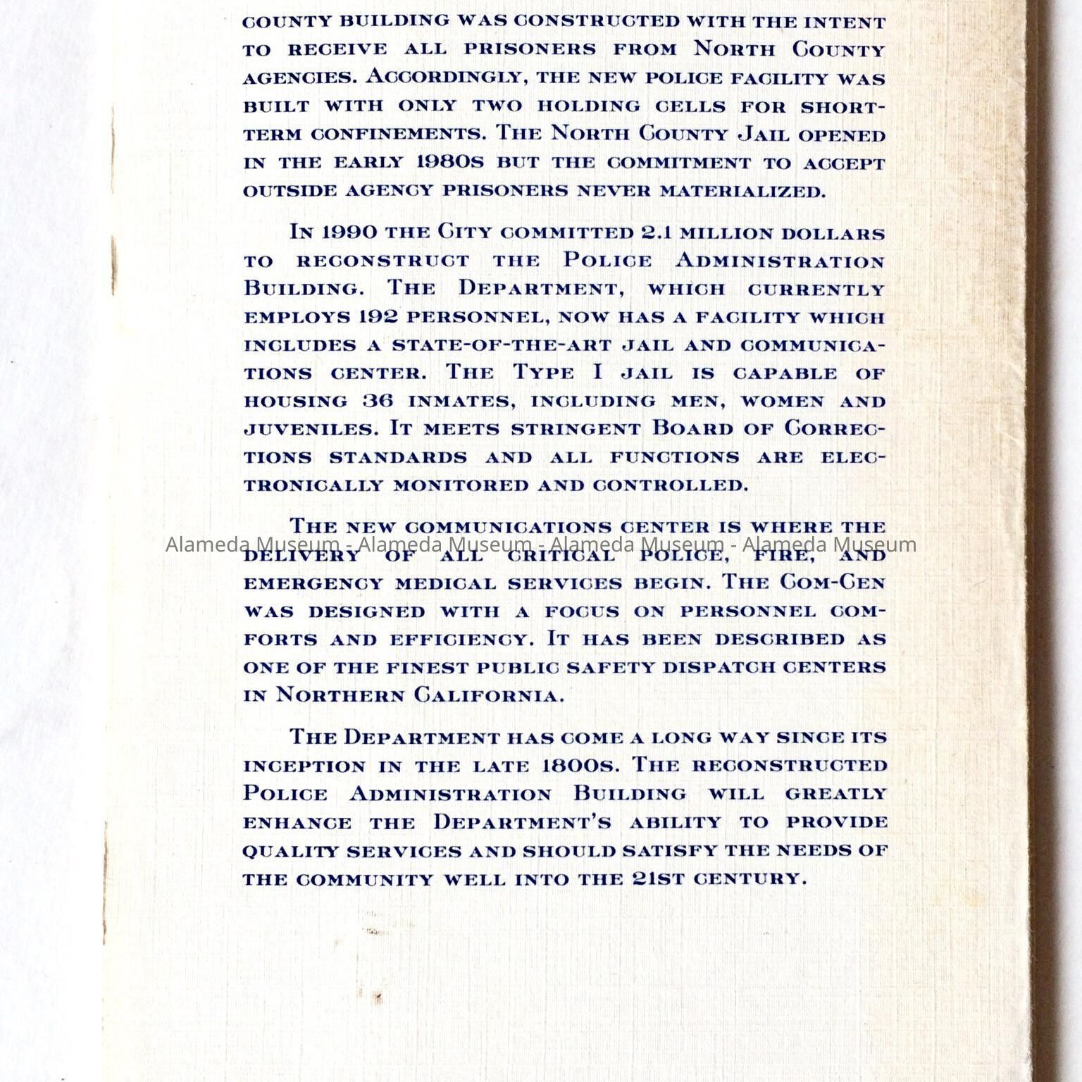 HISTORY OF OBJECT: A PROGRAM FOR THE DEDICATION OF THE NEW ALAMEDA POLICE DEPARTMENT AT THE CORNER OF OAK STREET AND LINCOLN AVENUE, ALAMEDA, DEDICATED ON NOVEMBER 21, 1991. THE PROGRAM ALSO INCLUDES A LIST OF PARTICIPANTS, AS WELL AS NAMES OF THE MAYOR AND CITY COUNCIL MEMBERS. ALSO INCLUDED IS THE HISTORY OF THE FOUNDING OF THE ALAMEDA POLICE DEPT.