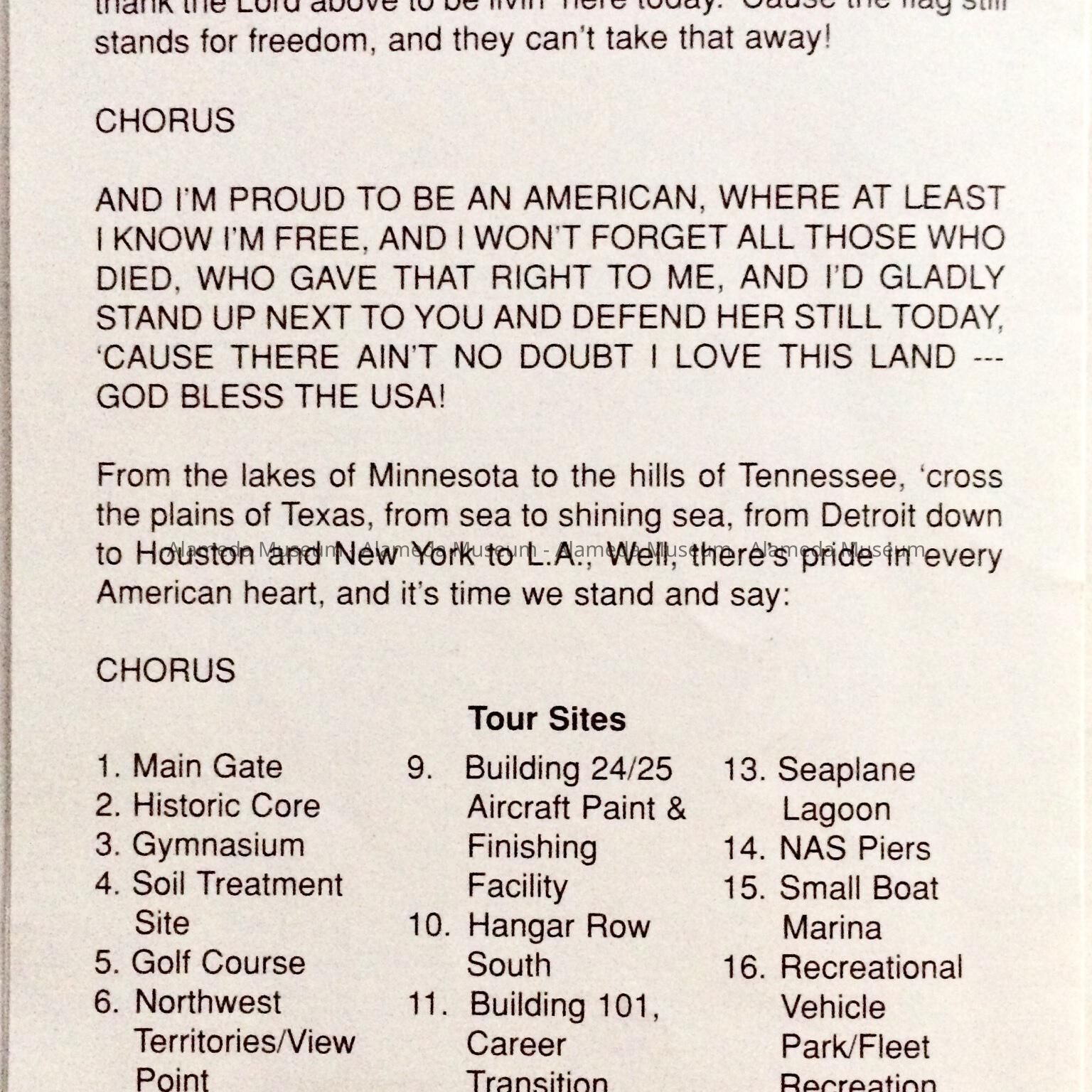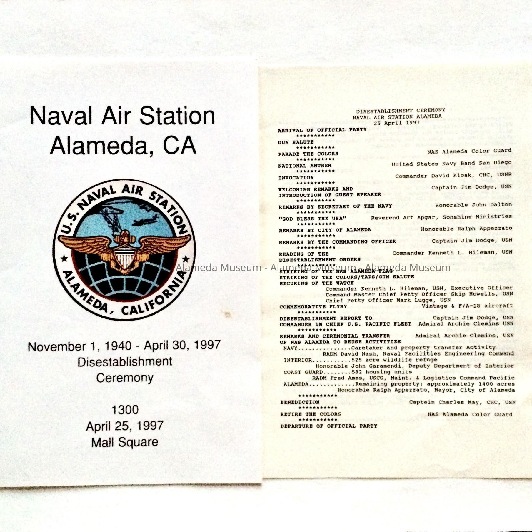 HISTORY OF OBJECT: A PROGRAM FOR THE DISESTABLISHMENT CEREMONIES HELD ON APRIL 25, 1997, FOR THE NAVAL AIR STATION, ALAMEDA, CA. PROGRAM ALSO INCLUDES A MAP DISPLAYING LOCATIONS OF STREETS AND VARIOUS BUILDINGS ON THE SITE.