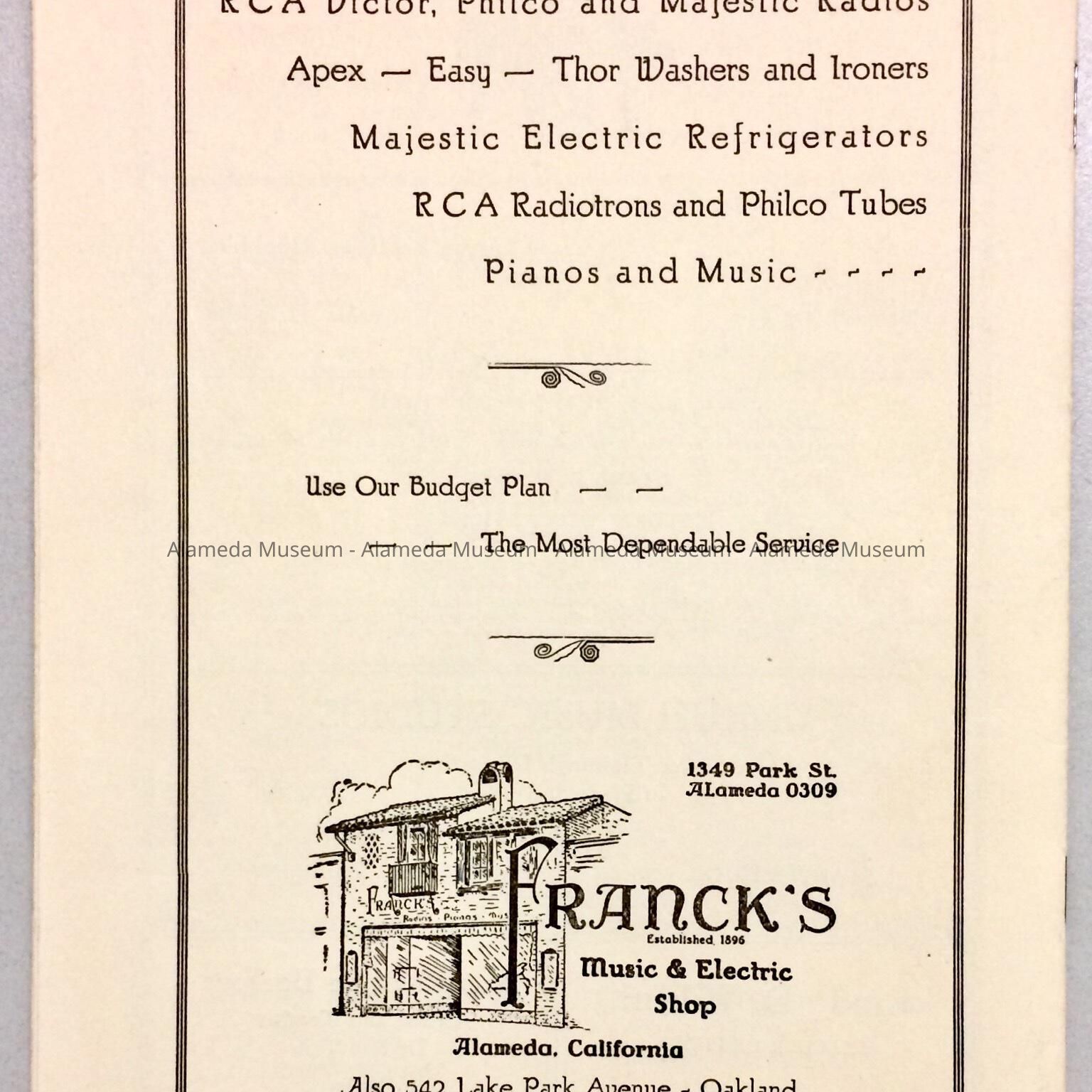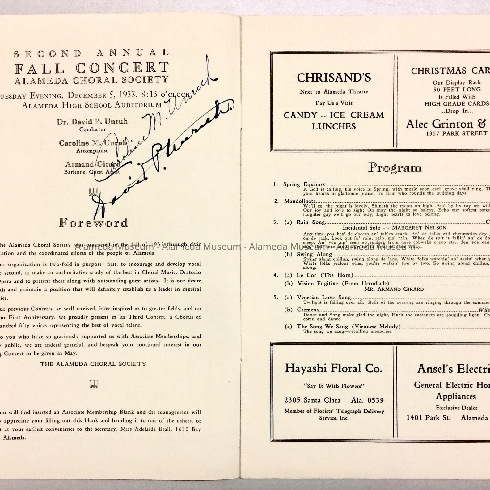 Program for a Fall Concert on December 5, 1933 performed by the Alameda Choral Society in the Alameda High School Auditorium. This particular copy is autographed by the Conductor and accompanist. Program also includes ads for local businesses. Given to the Alameda Historical Society prior to 1971 and never catalogued.