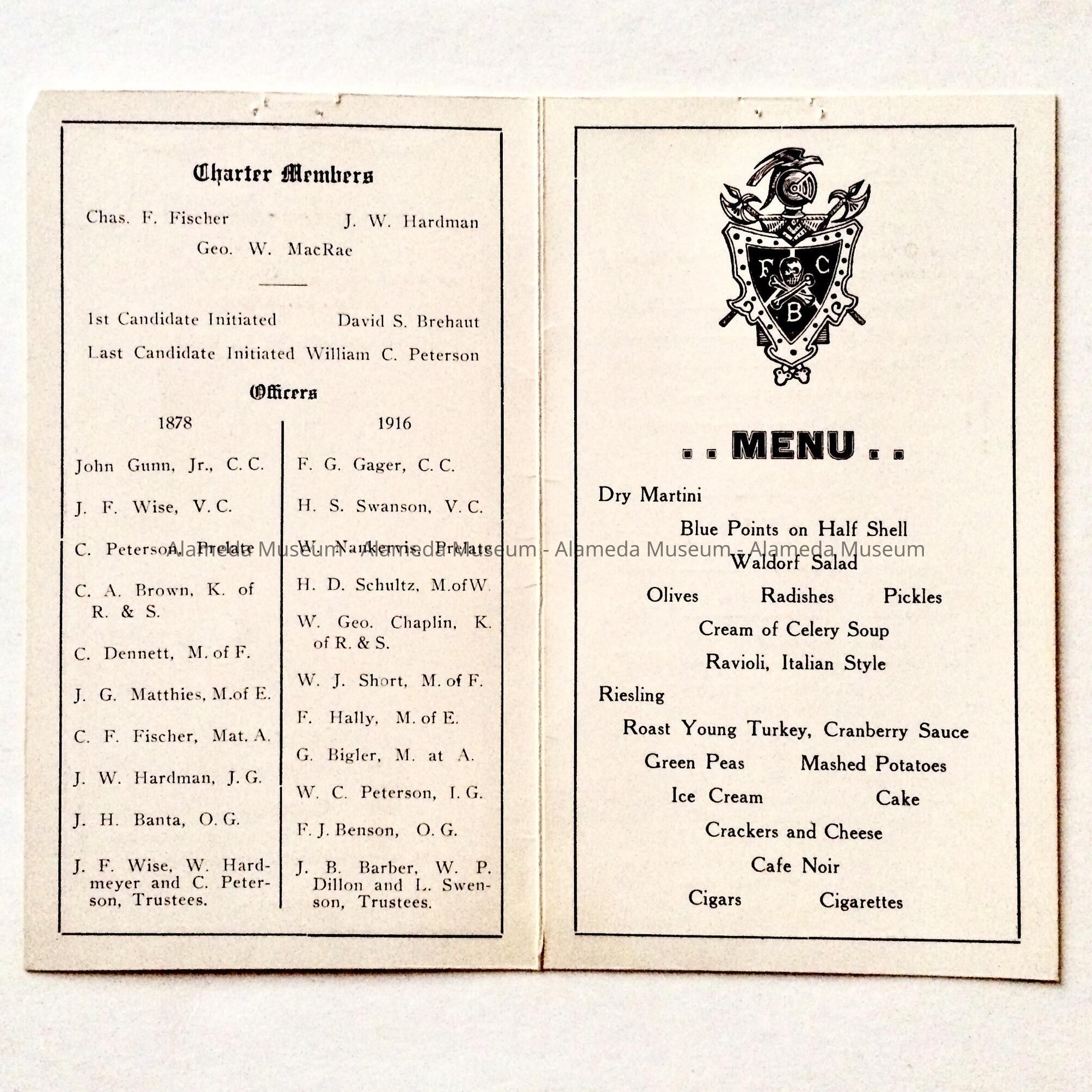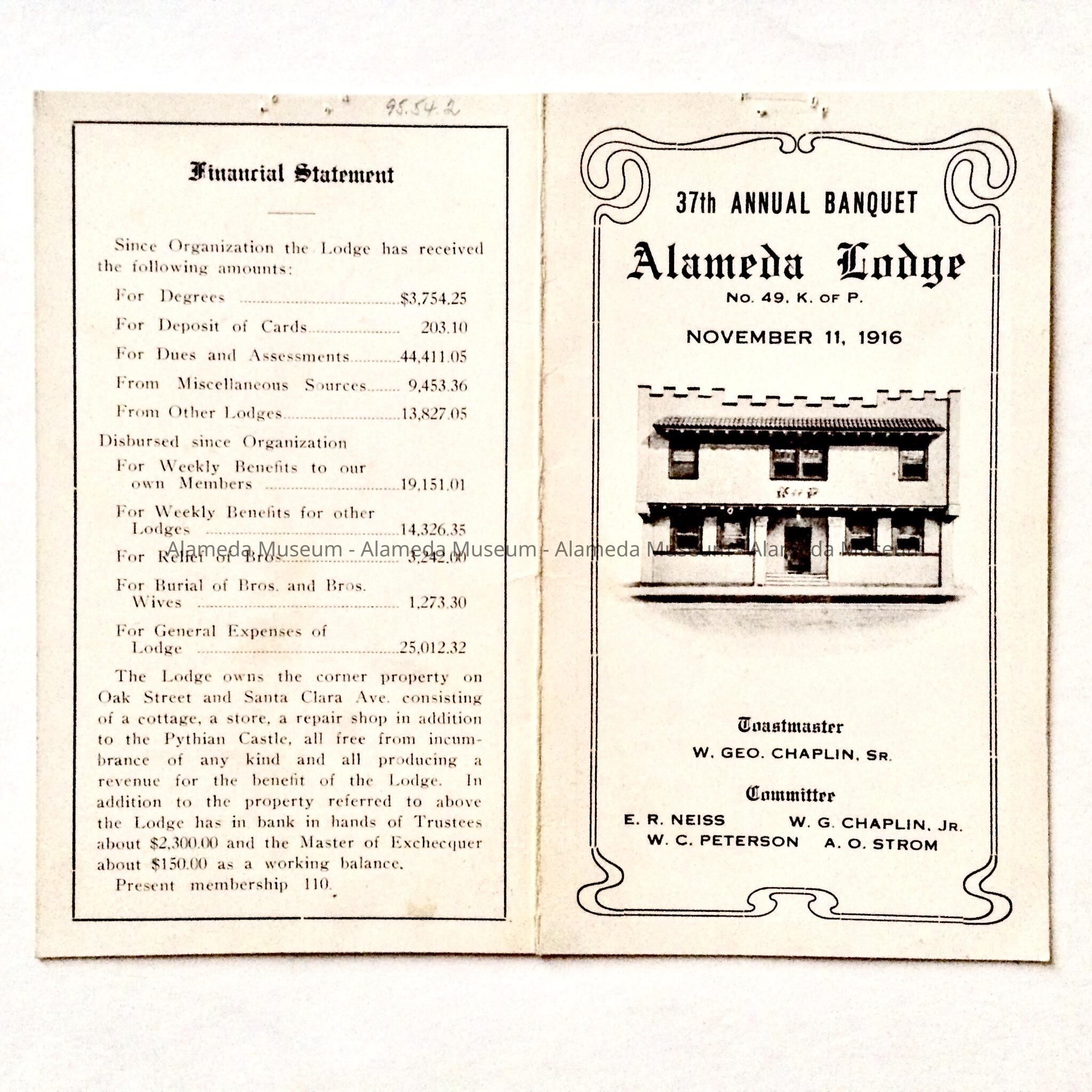 Description: Folder of white paper stock imprinted in black on all sides. The front page has the message: "37th Annual Banquet Alameda Lodge No. 49, K. of P.", the date of November 11, 1916, and the names of the Toastmaster and the Committee members, all imprinted in various type fonts. A half-tone view of the lodge building is also shown, and an ornamental border outlines this page. Pages 2, 3 and 4 list charter and current members, the menu for the banquet and a financial statement, respectively. Staple holes are found along the top margin of each page.