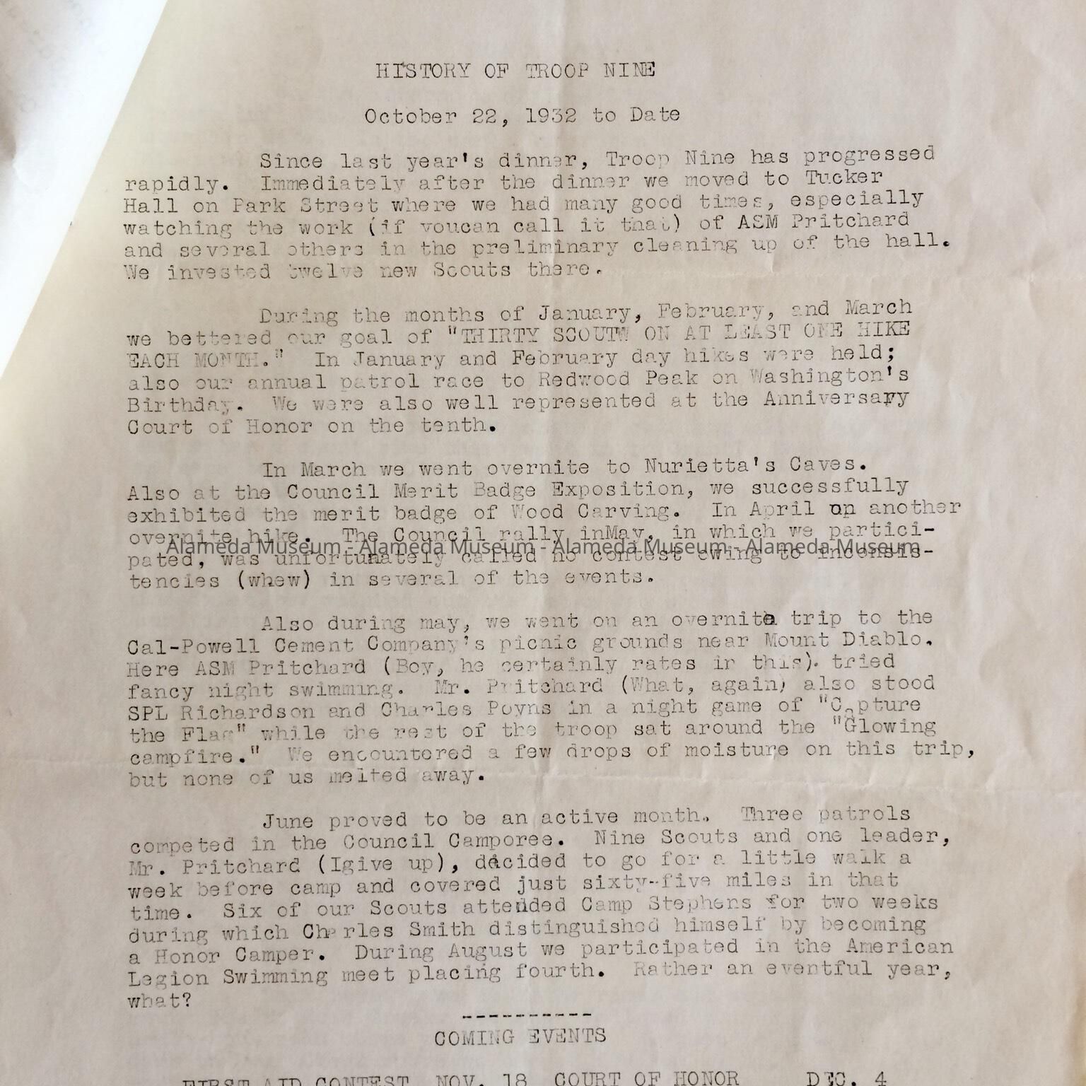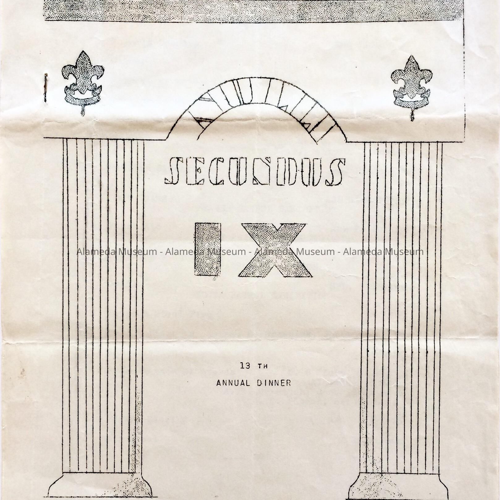 History: Program appears to have been created for a dinner honoring the history of Troop #9 Alameda Boy Scouts. Also included is a roster of members.
