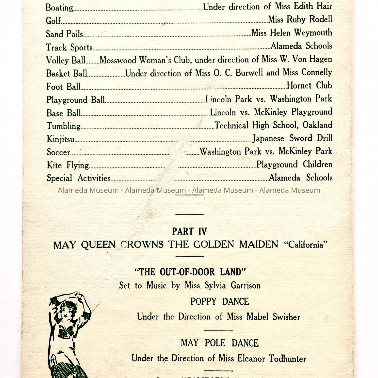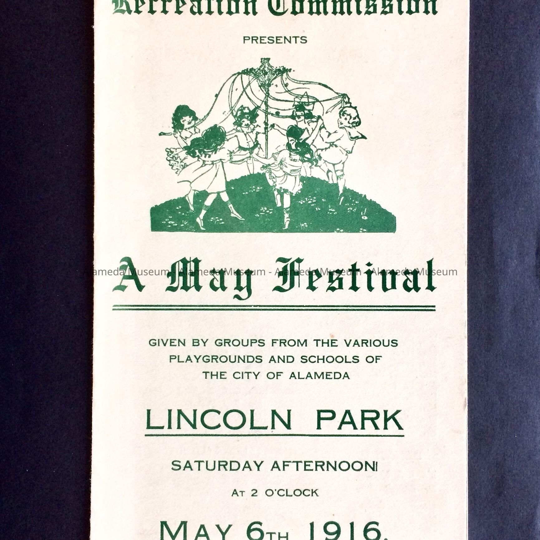 HISTORY OF OBJECT: A PROGRAM FOR AN EVENT HELD AT LINCOLN PARK ON MAY 6, 1916; A MAY FESTIVAL UNDER THE AUSPICES OF THE RECREATION COMMISSION. THE PROGRAM LISTS NAMES OF PARTICIPANTS AND EVENTS BEING HELD.
