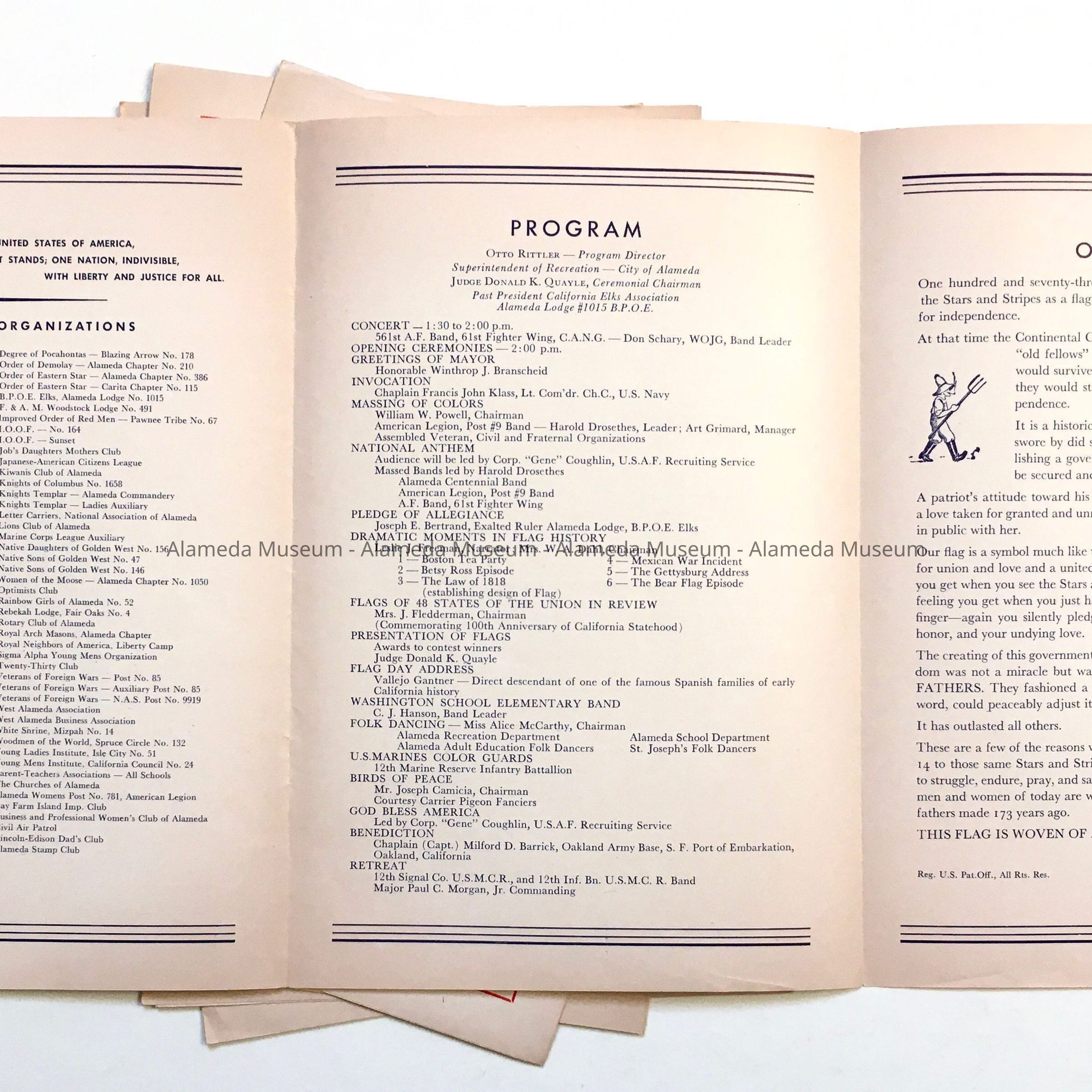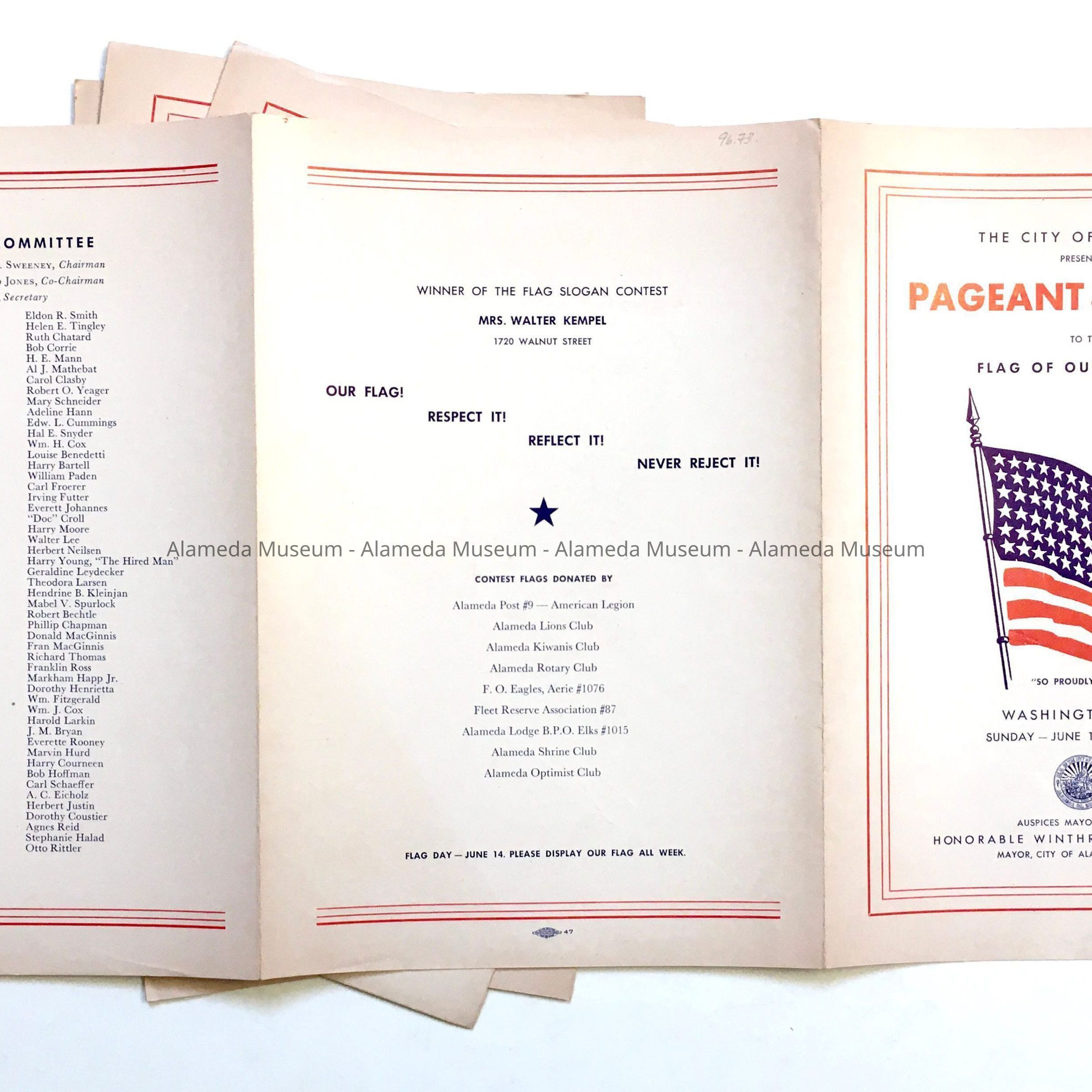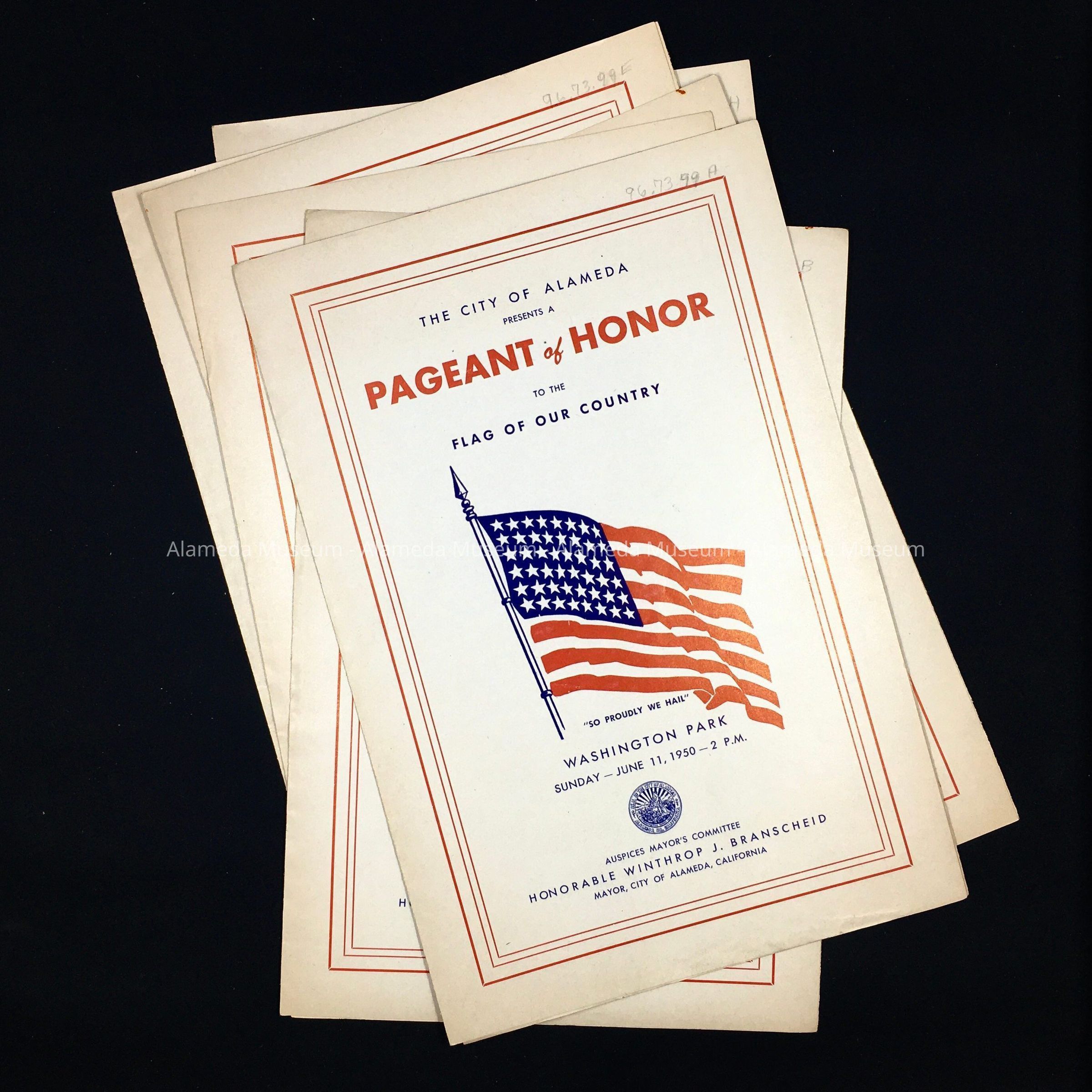 A PROGRAM FOR A PATRIOTIC EVENT HELD IN ALAMEDA'S WASHINGTON PARK ON JUNE 11, 1950. PROGRAM COPIES INCLUDE LISTS OF PARTICIPANTS, EVENTS, AND NAMES OF COMMITTEE MEMBERS.