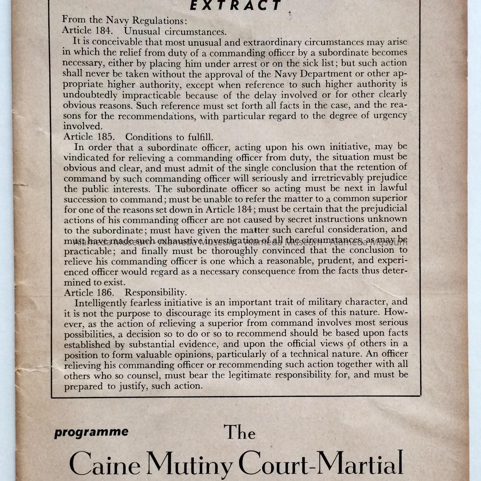 Description: Soft bound program. Cover has a bold printed caption: "The Caine Mutiny Court/Marshal ".