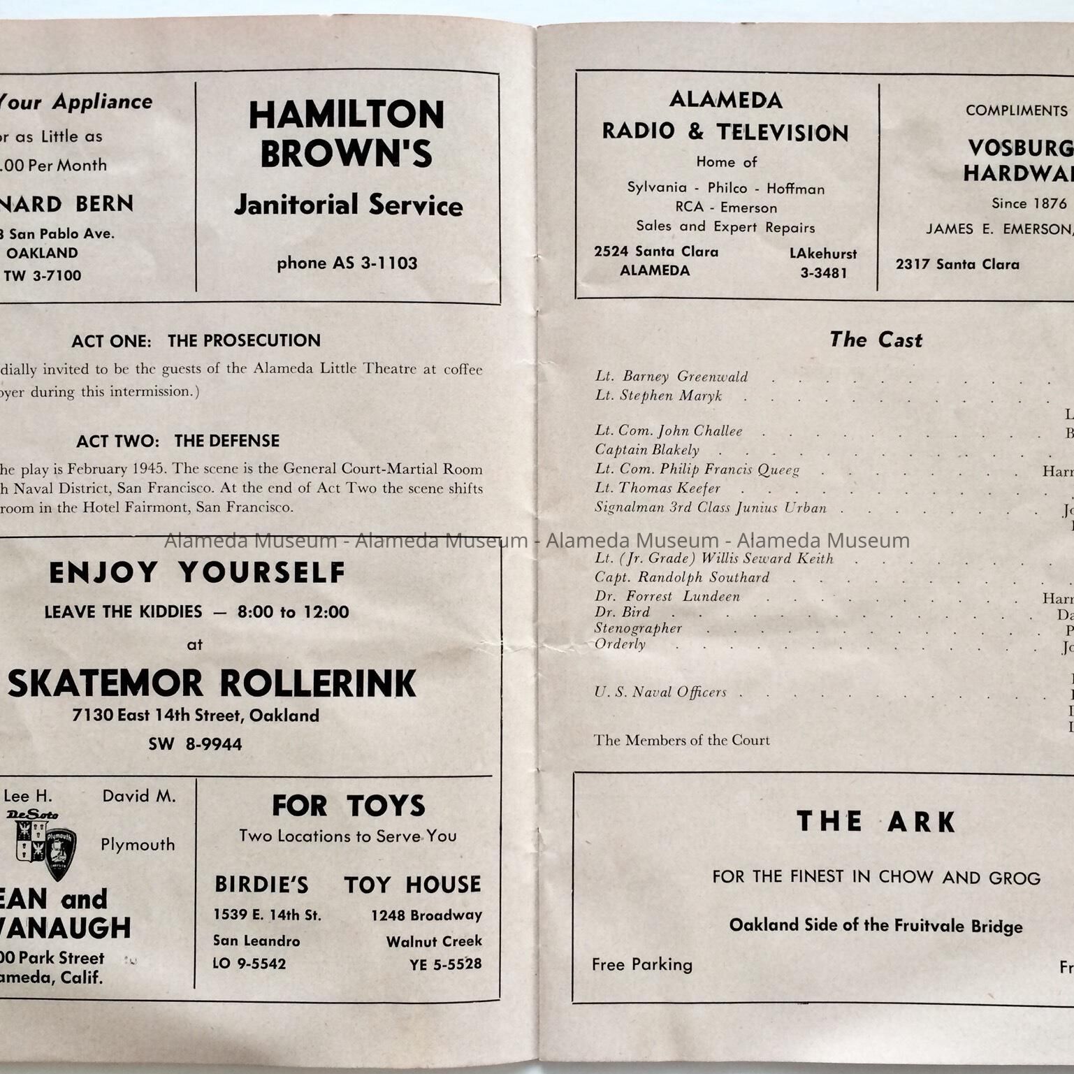History of Object: Program for the play entitled "The Caine Mutiny court/Marshal" performed at the Alameda Little Theater April 20 and May 12, 1956.
