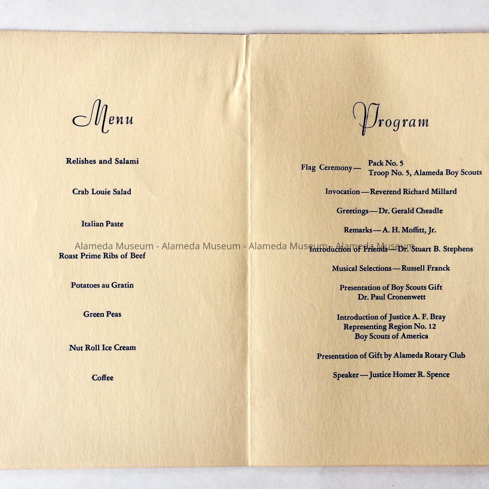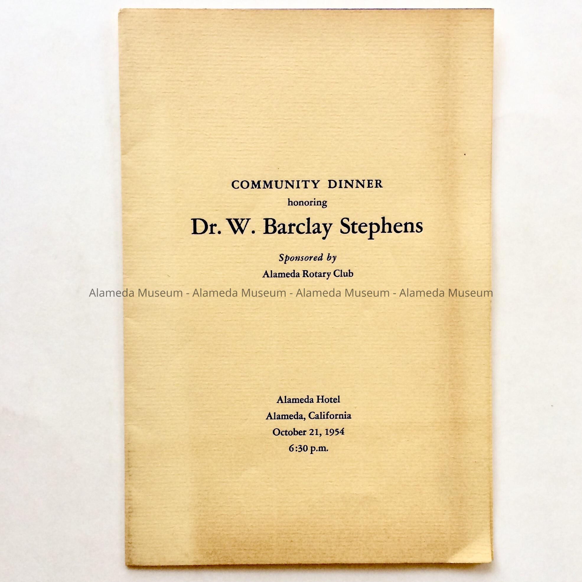 A PROGRAM FOR A DINNER HELD IN HONOR OF DR W B STEPHENS, SPONSORED BY THE ALAMEDA ROTARY CLUB AND HELD AT THE ALAMEDA HOTEL ON OCTOBER 21, 1954. THE ALAMEDA BRANCH OF THE BOY SCOUTS OF AMERICA WERE REPRESENTED DURING THE PROGRAM. DR STEPHENS WAS AN INFLUENTIAL SUPPORTER OF THE BSA ORGANIZATION. ITEM WAS DONATED TO THE ALAMEDA HISTORICAL SOCIETY PRIOR TO 1971 AND NOT OFFICIALLY CATALOGED BY THEM.
