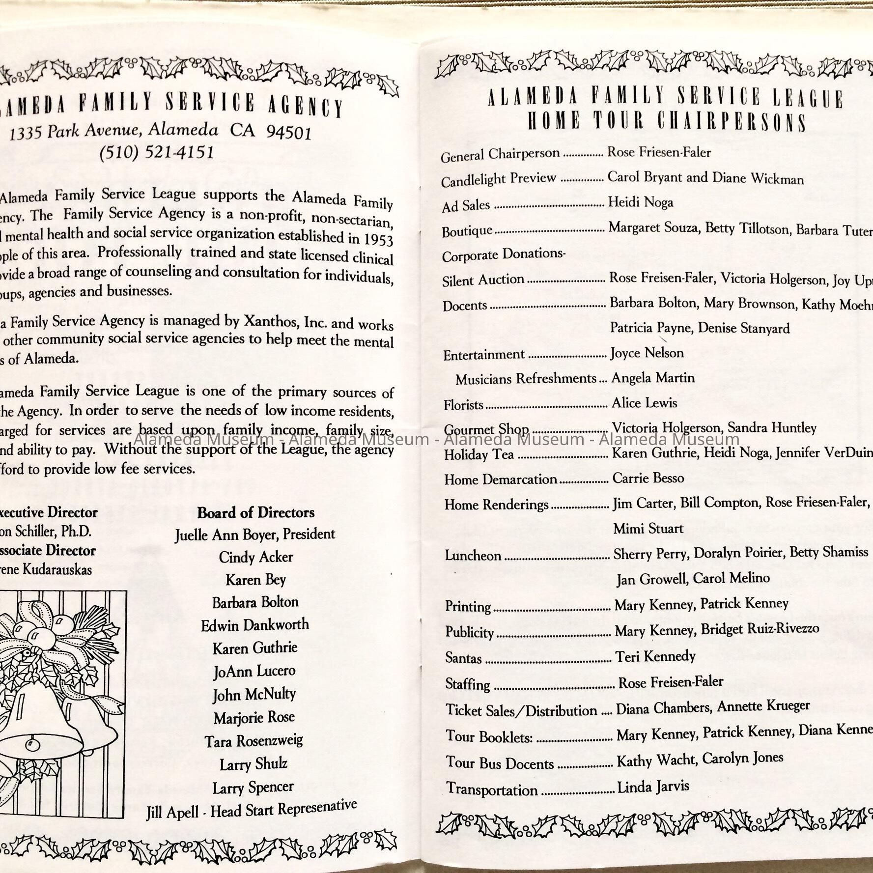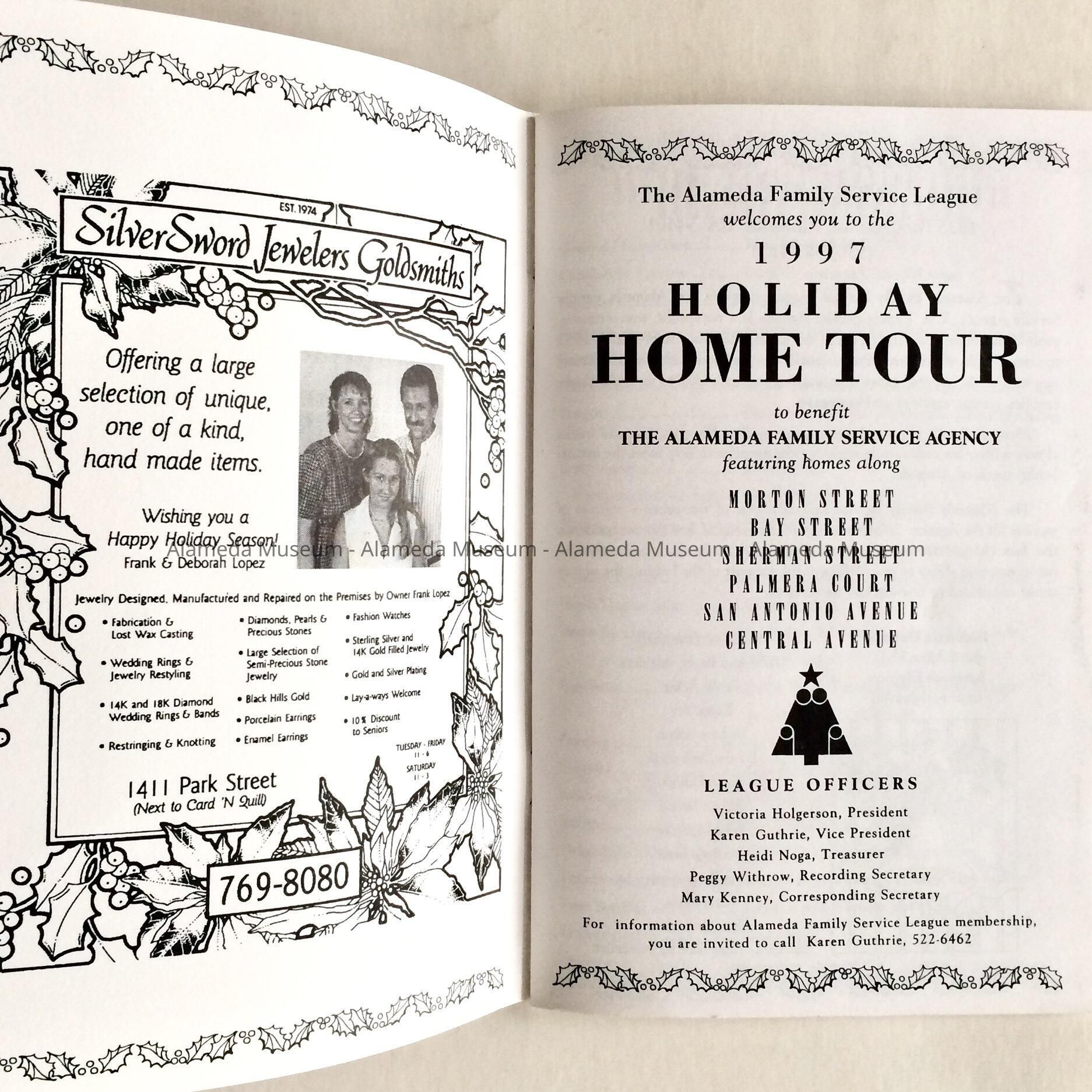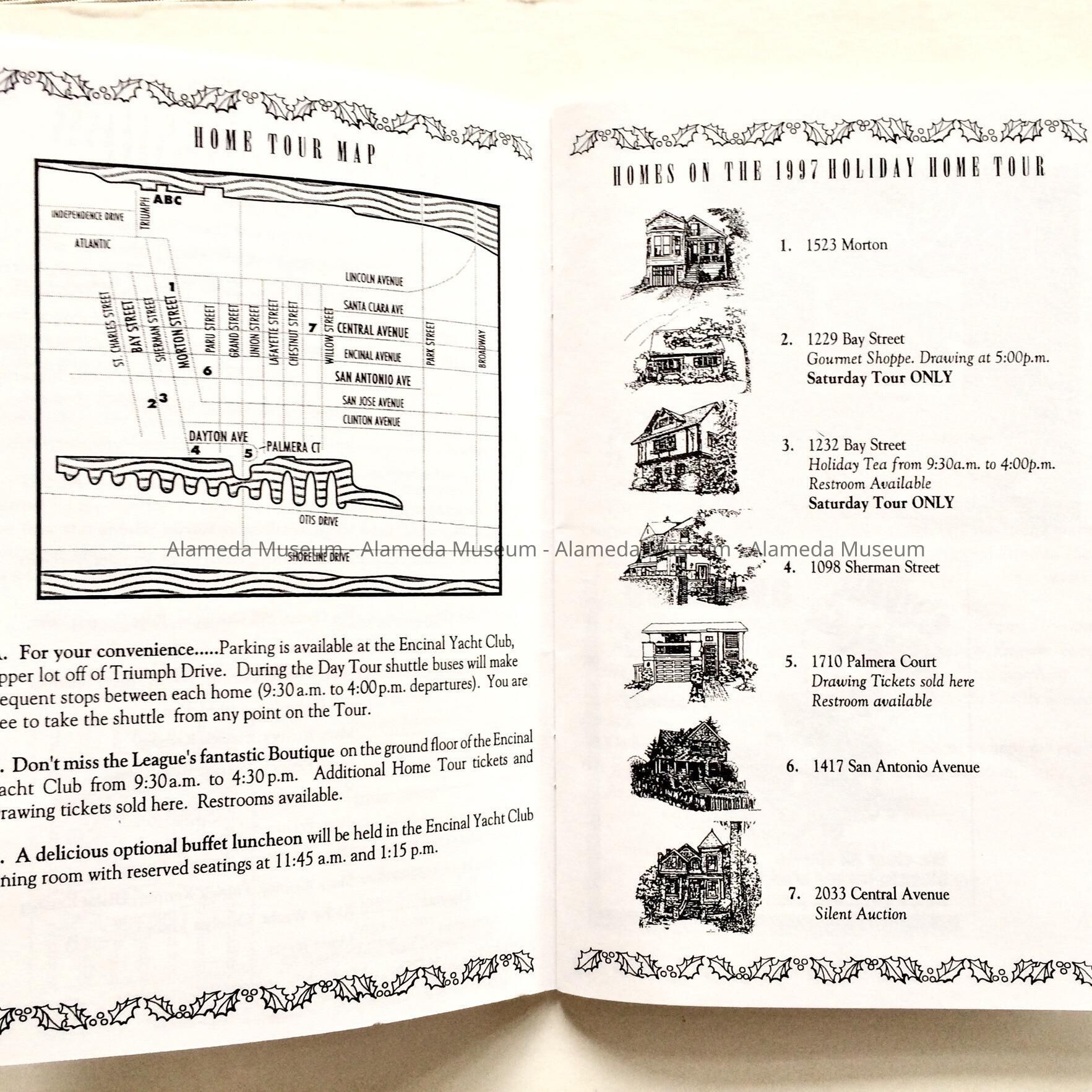 HISTORY OF OBJECT: PROGRAM FOR THE ALAMEDA FAMILY SERVICES LEAGUE HOLIDAY HOME TOUR OF 1997. THE BOOKLET DESCRIBES THE HOUSES AS WELL AS INFORMATION CONCERNING HISTORY OF EACH, ETC.