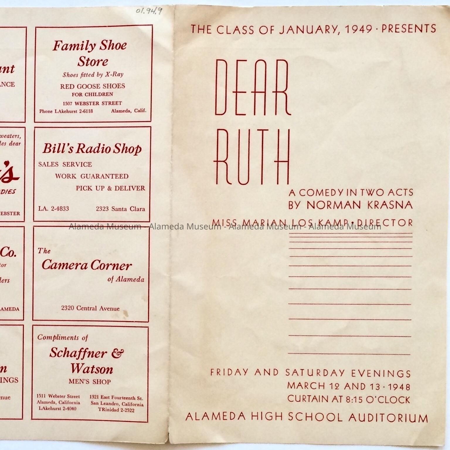 Program for the class play “Dear Ruth” performed by the students of Alameda High School on March 13 - March 13, 1948. Included in the program are advertisements for local businesses.