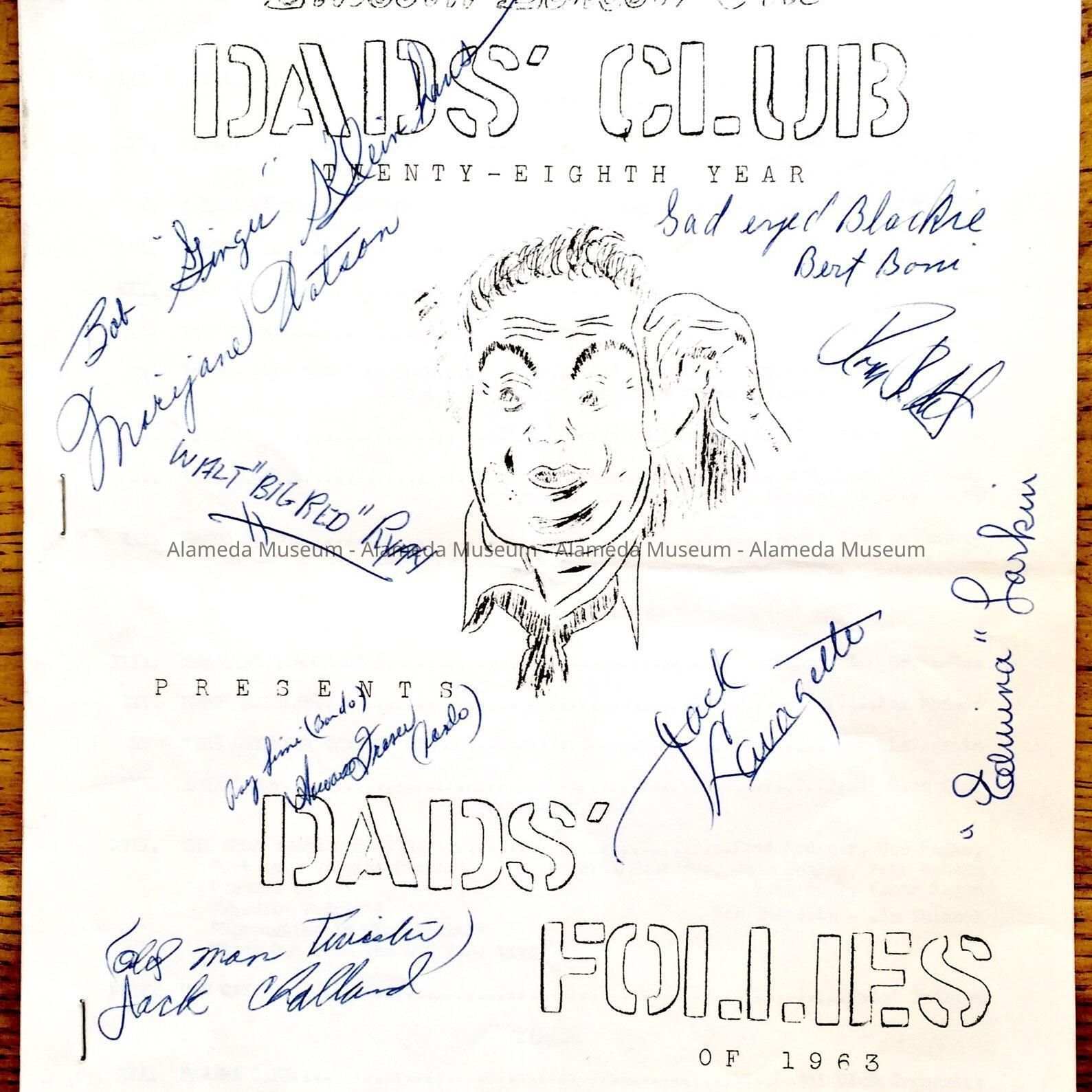 Description: staple-bound mimeographed copy of a program, with front page featuring a drawing of a face of a man wiping his temple with a cloth. The front page has 10 signatures. Title: 'Lincoln - Edison - Otis Dads' Club - Twenty-Eight Year Dads' Follies of 1963'.