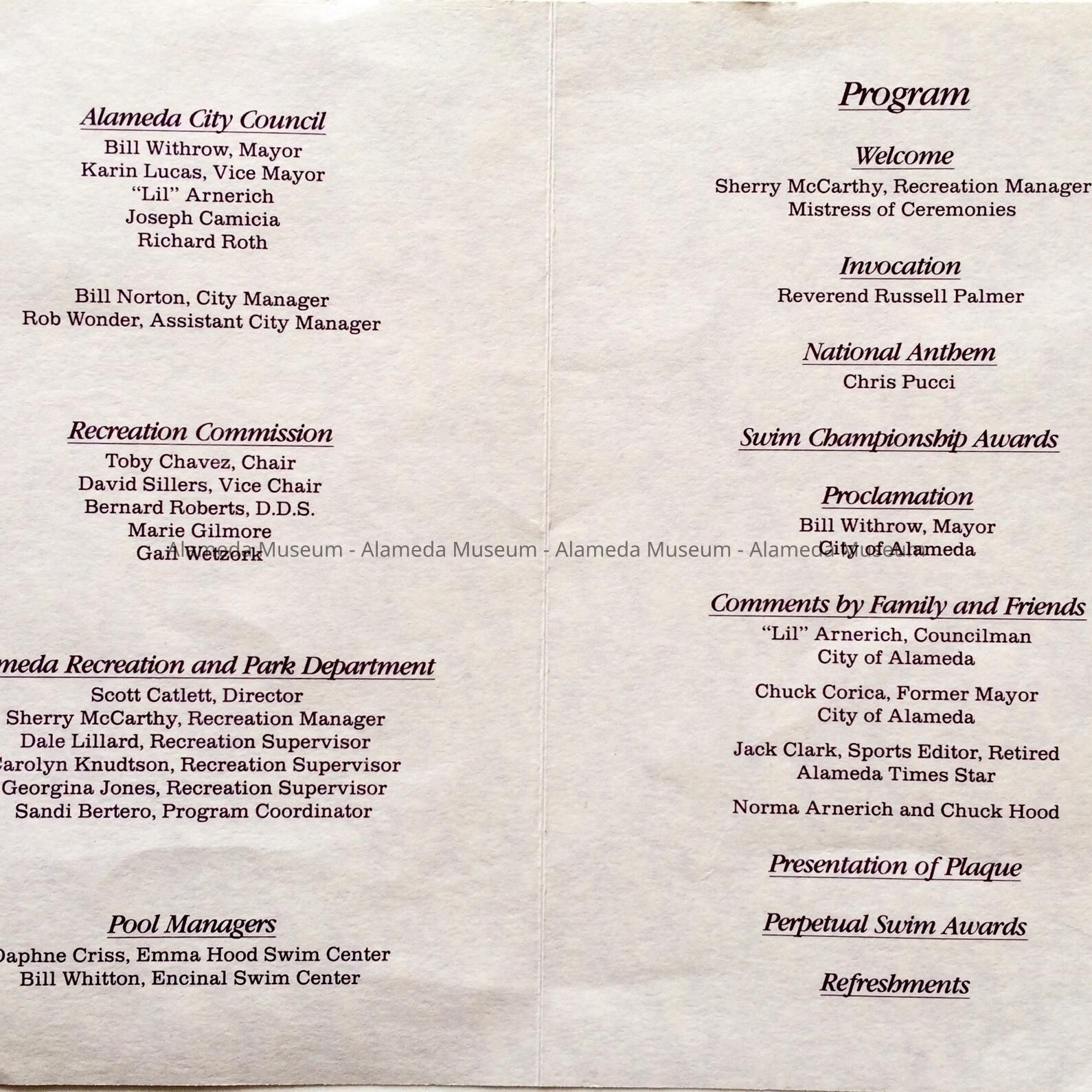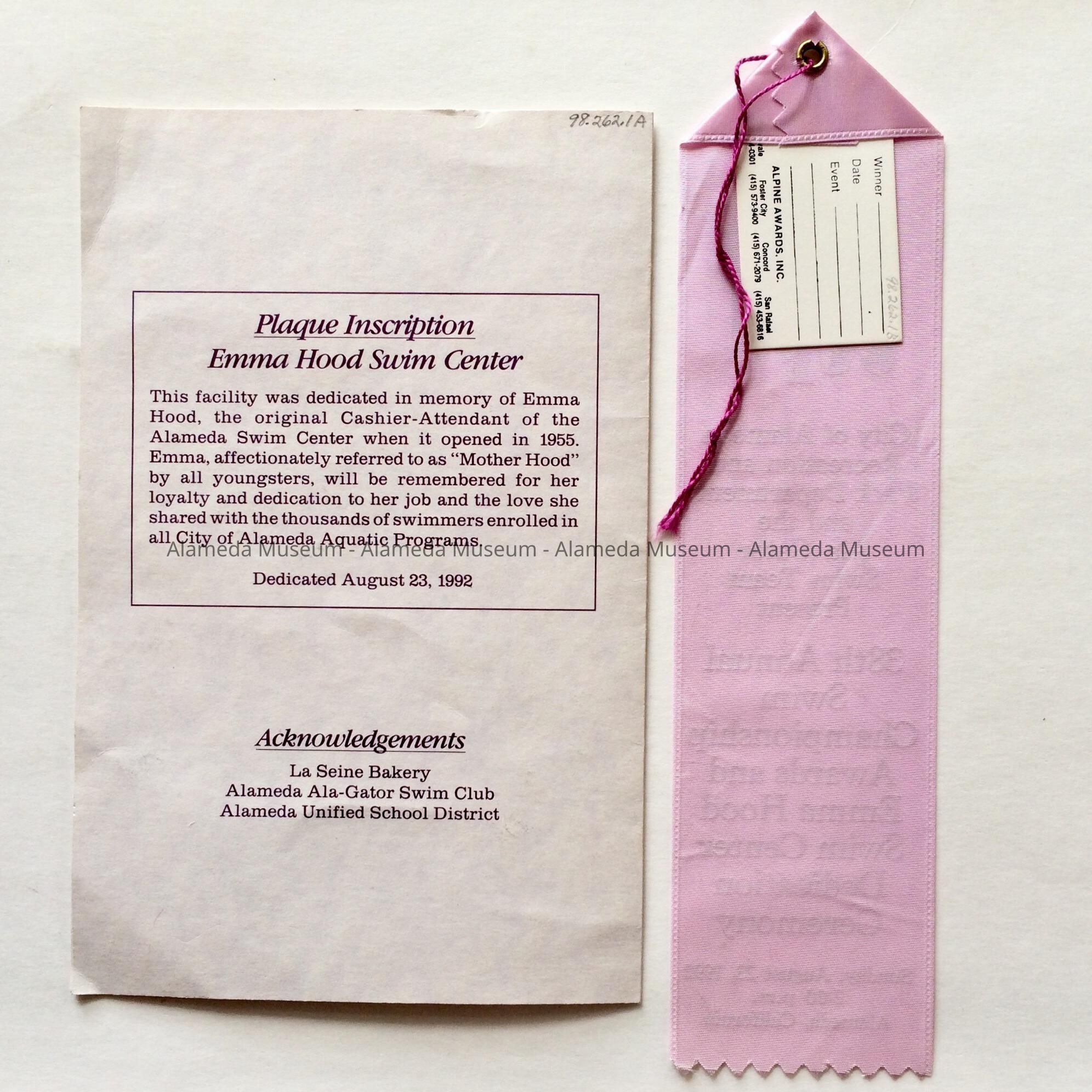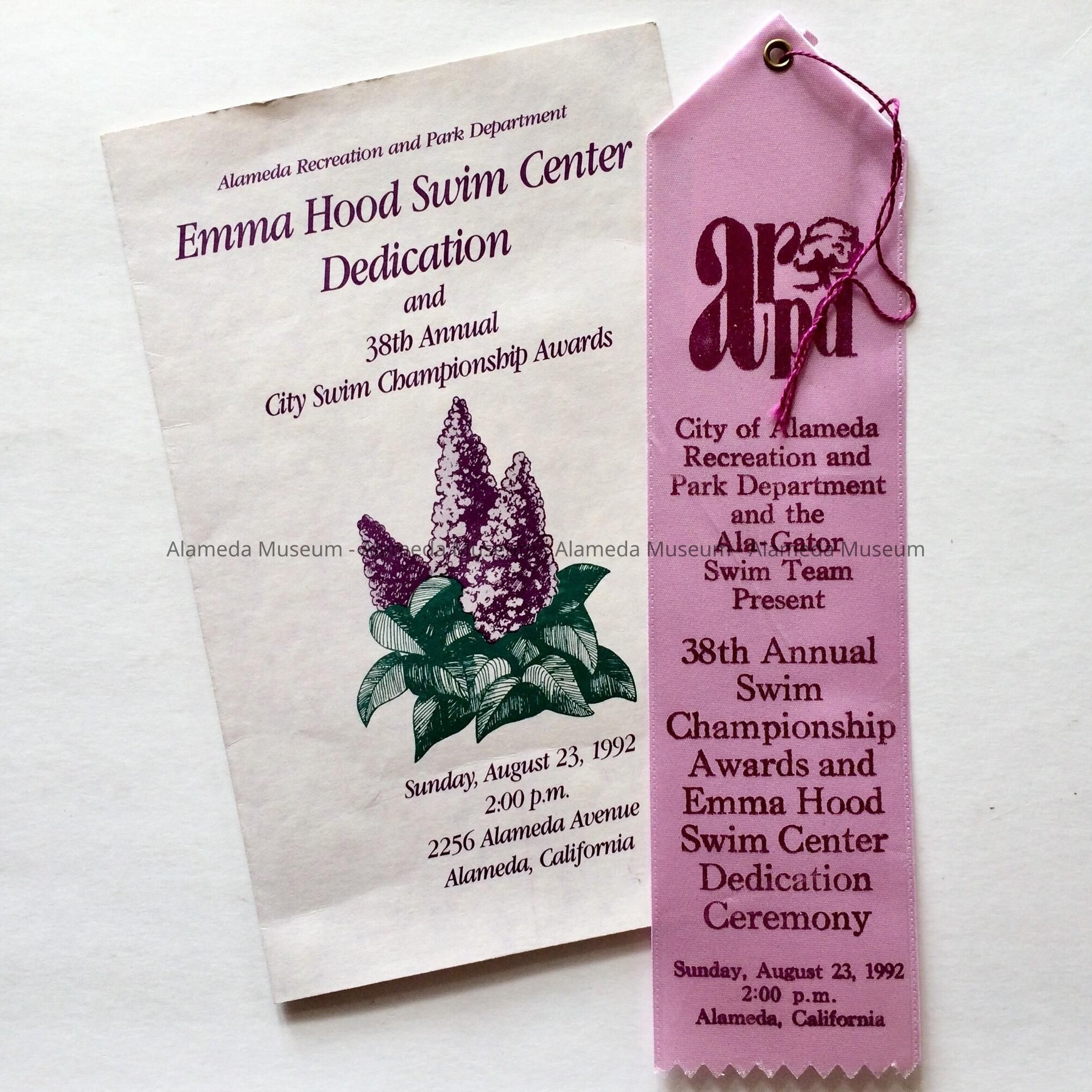 PROGRAM FOR THE DEDICATION OF THE EMMA HOOD SWIM CENTER AND 38th ANNUAL CITY SWIM CHAMPIONSHIP AWARDS, HELD ON SUNDAY, AUGUST 23, 1992, AT 2256 ALAMEDA AVENUE, ALAMEDA. PROGRAM LISTS NAMES OF DIGNITARIES. AWARD AND RIBBON WERE PRESENTED AT THAT CEREMONY BY THE ALAMEDA RECREATION AND PARKS DEPARTMENT.