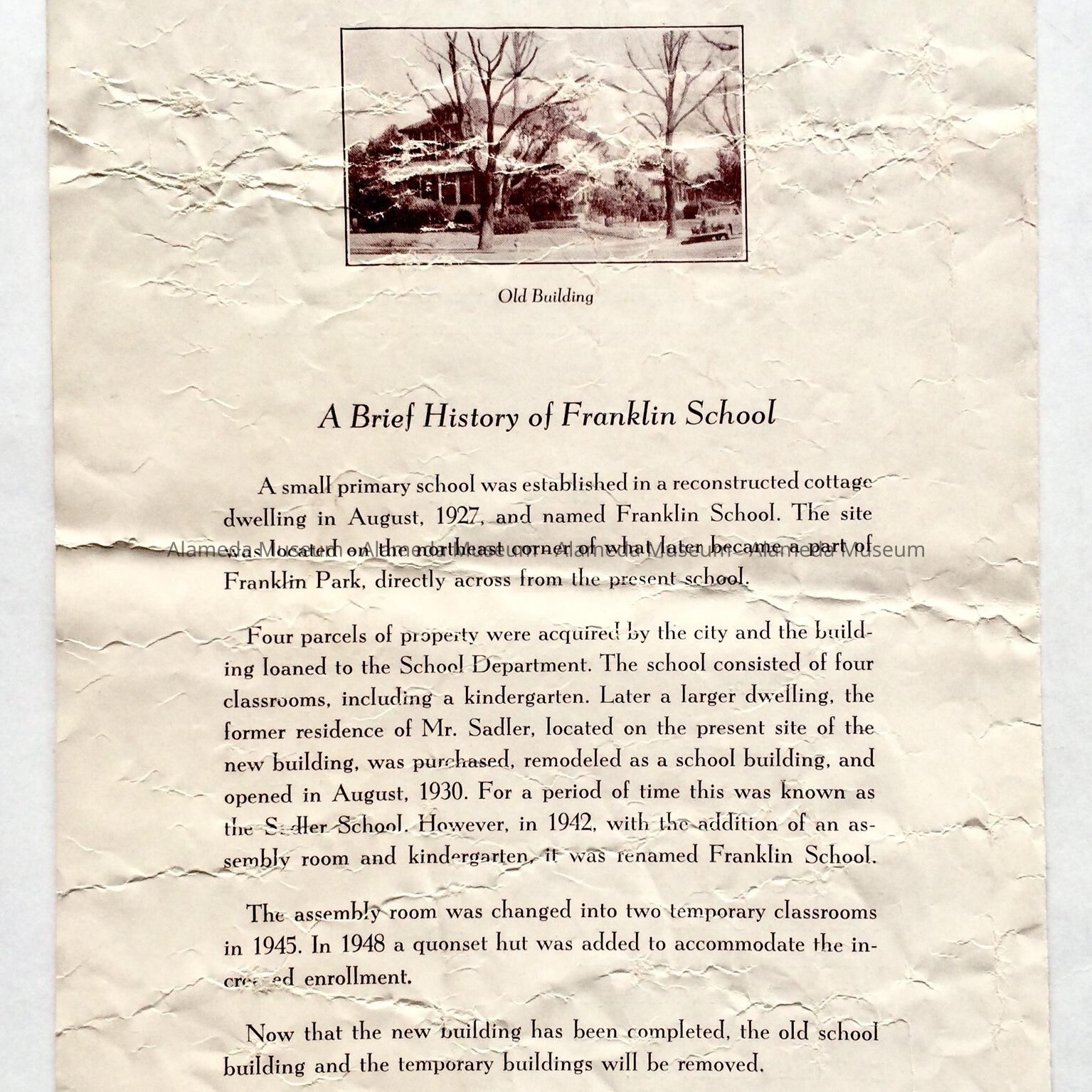 History: Program for the dedication of the new Franklin School with a listing of construction data and a history of the school.