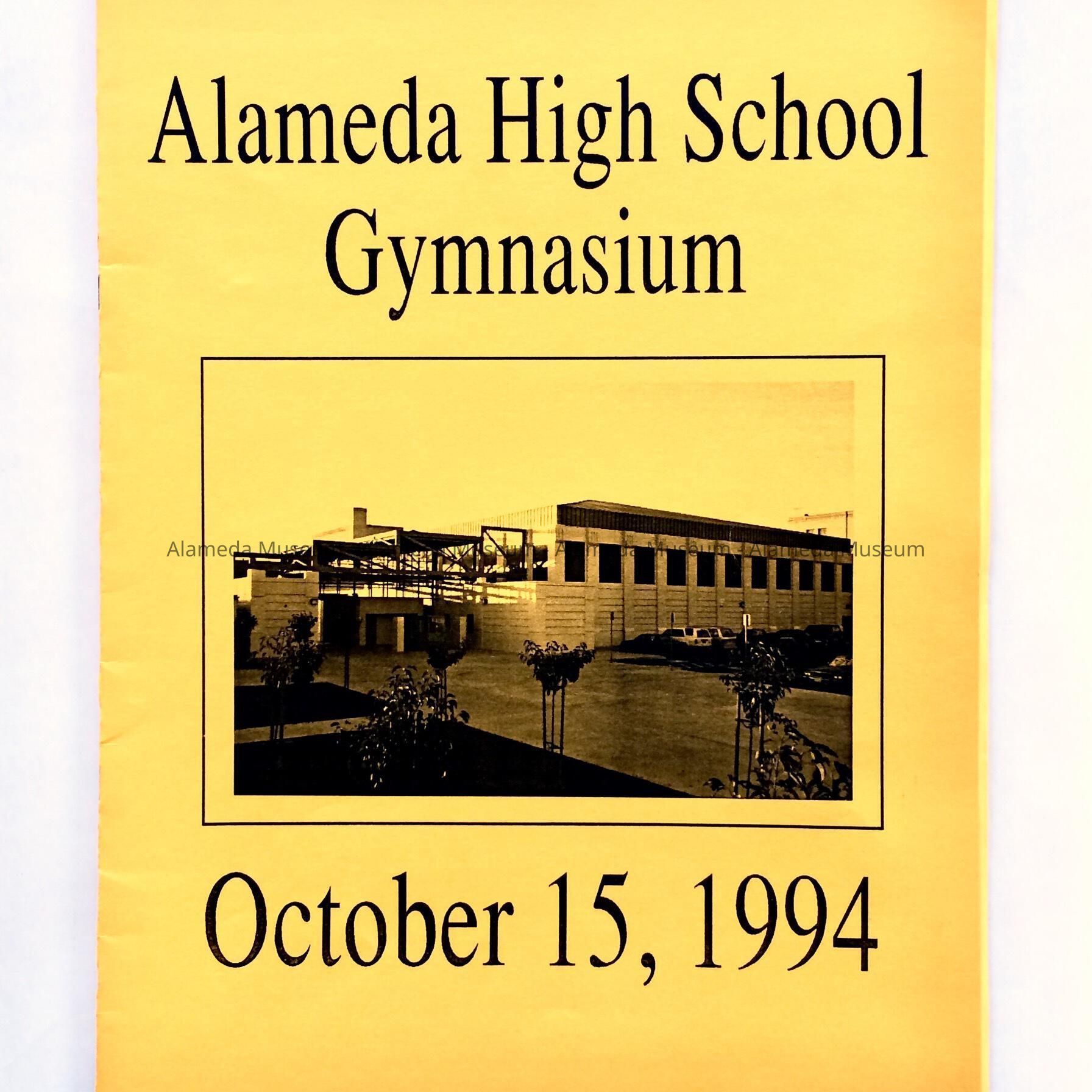 DESCRIPTION: SOFT-BOUND PROGRAM WITH BOLD-PRINTED CAPTION, "ALAMEDA HIGH SCHOOL GYMNASIUM, OCTOBER 15, 1994," ON THE COVER IN BLACK-COLORED TYPE ON A GOLD-COLORED PAPER BACKGROUND. COVER ALSO INCLUDES AN ILLUSTRATION OF THE NEW GYMNASIUM.