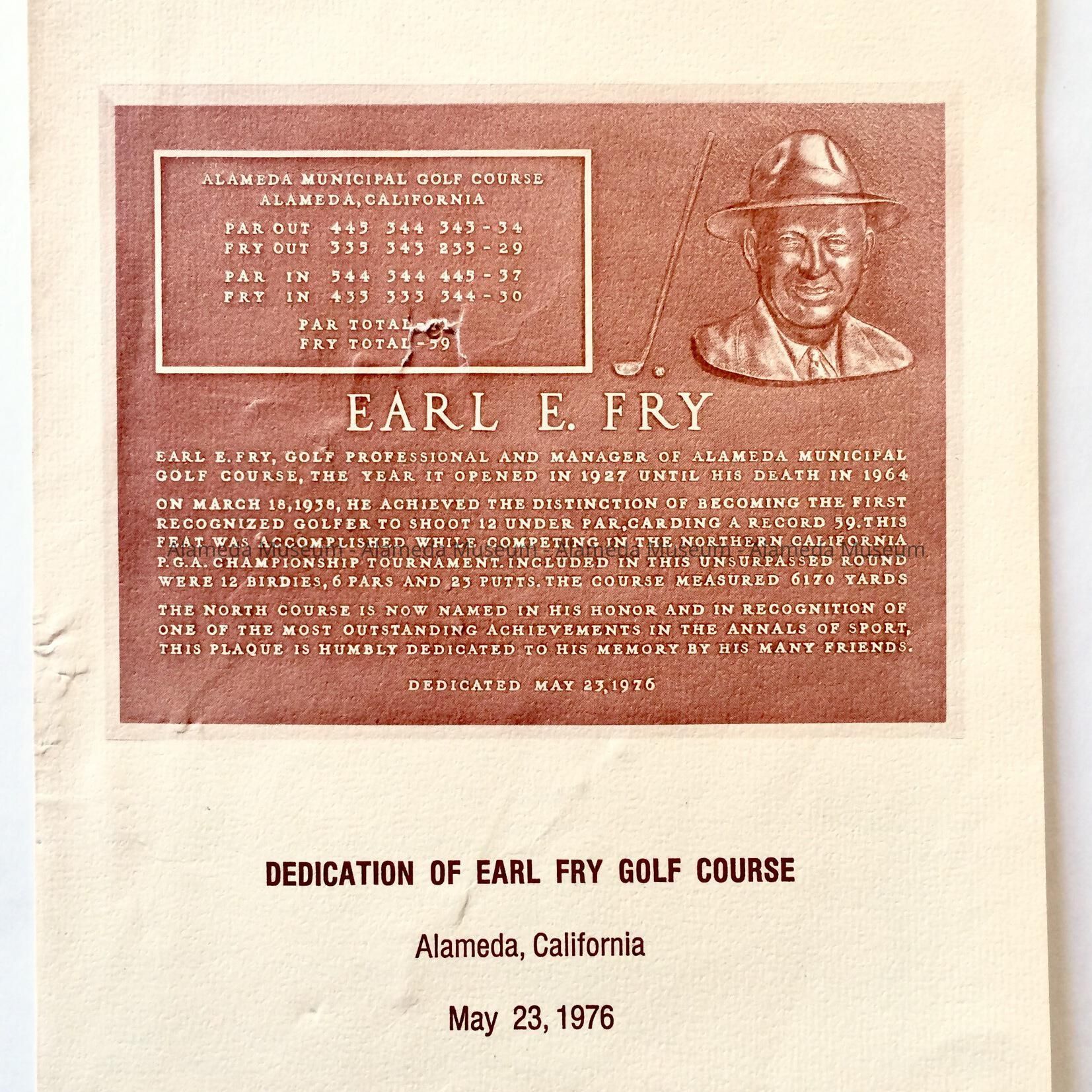 A PROGRAM ISSUED FOR THE DEDICATION OF THE EARL FRY GOLF COURSE, ALAMEDA, CALIF., MAY 23, 1976. MR FRY WAS A GOLF PRO AND MEMBER OF THE ALAMEDA MUNICIPAL GOLF COURSE FROM THE YEAR OF ITS OPENING IN 1927 UNTIL HIS DEATH IN 1964.