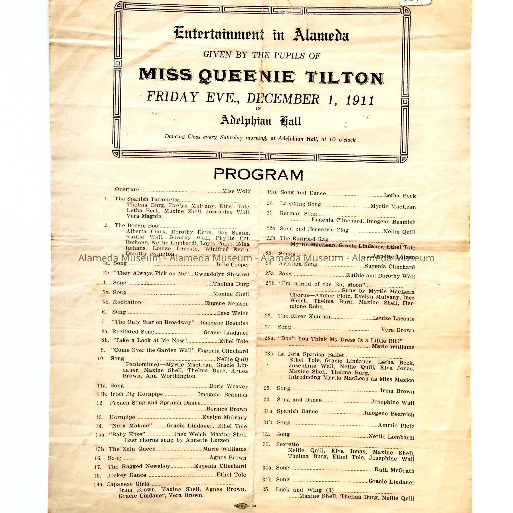 PROGRAM FOR ENTERTAINMENT TO BE PRESENTED BY THE PUPILS OF MS QUEENIE TILTON, TO BE HELD AT THE ADELPHIAN HALL ON DECEMBER 1, 1911. PROGRAM INCLUDES NAMES OF VARIOUS ACTORS AND OTHER PARTICIPANTS.