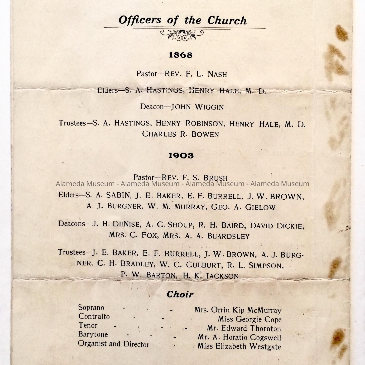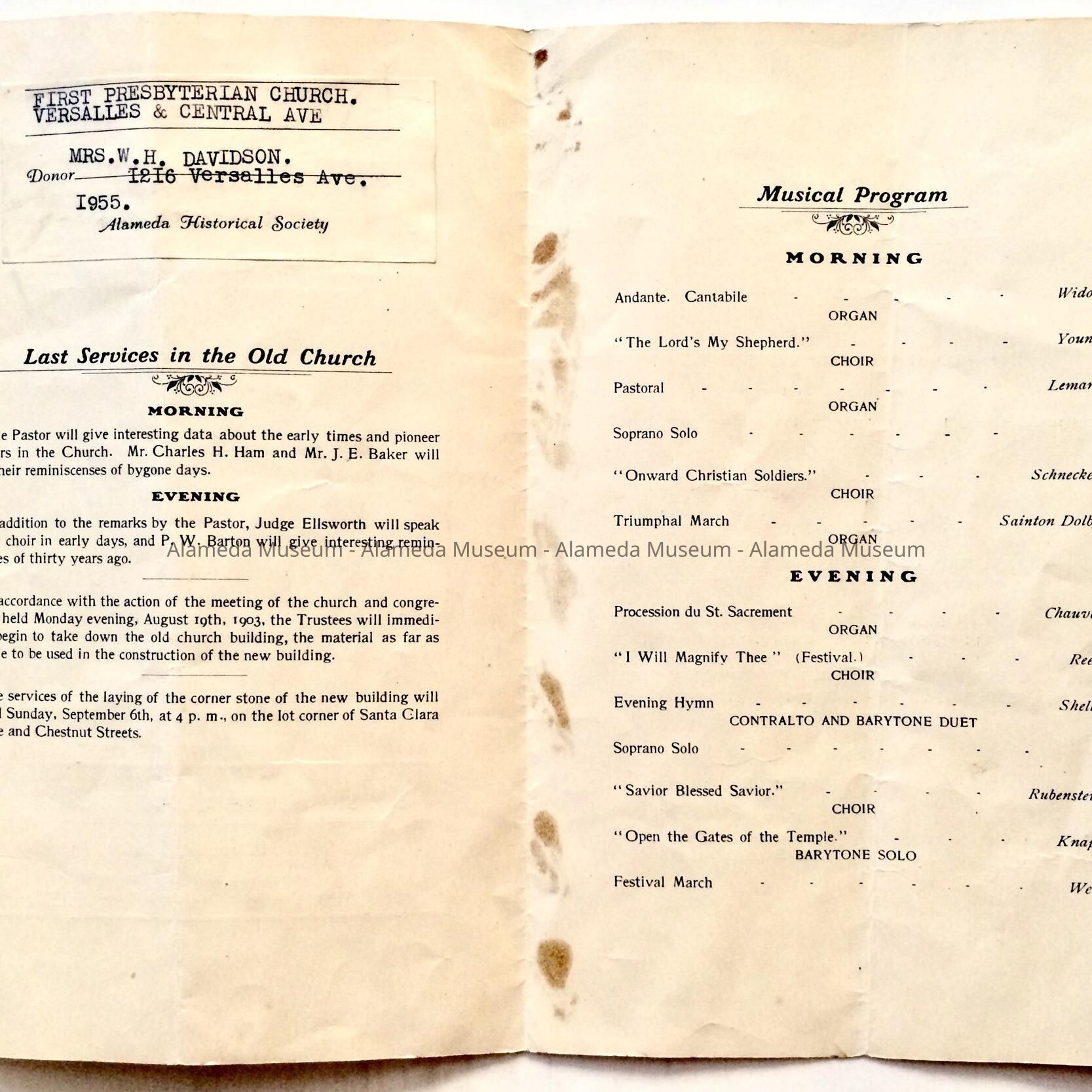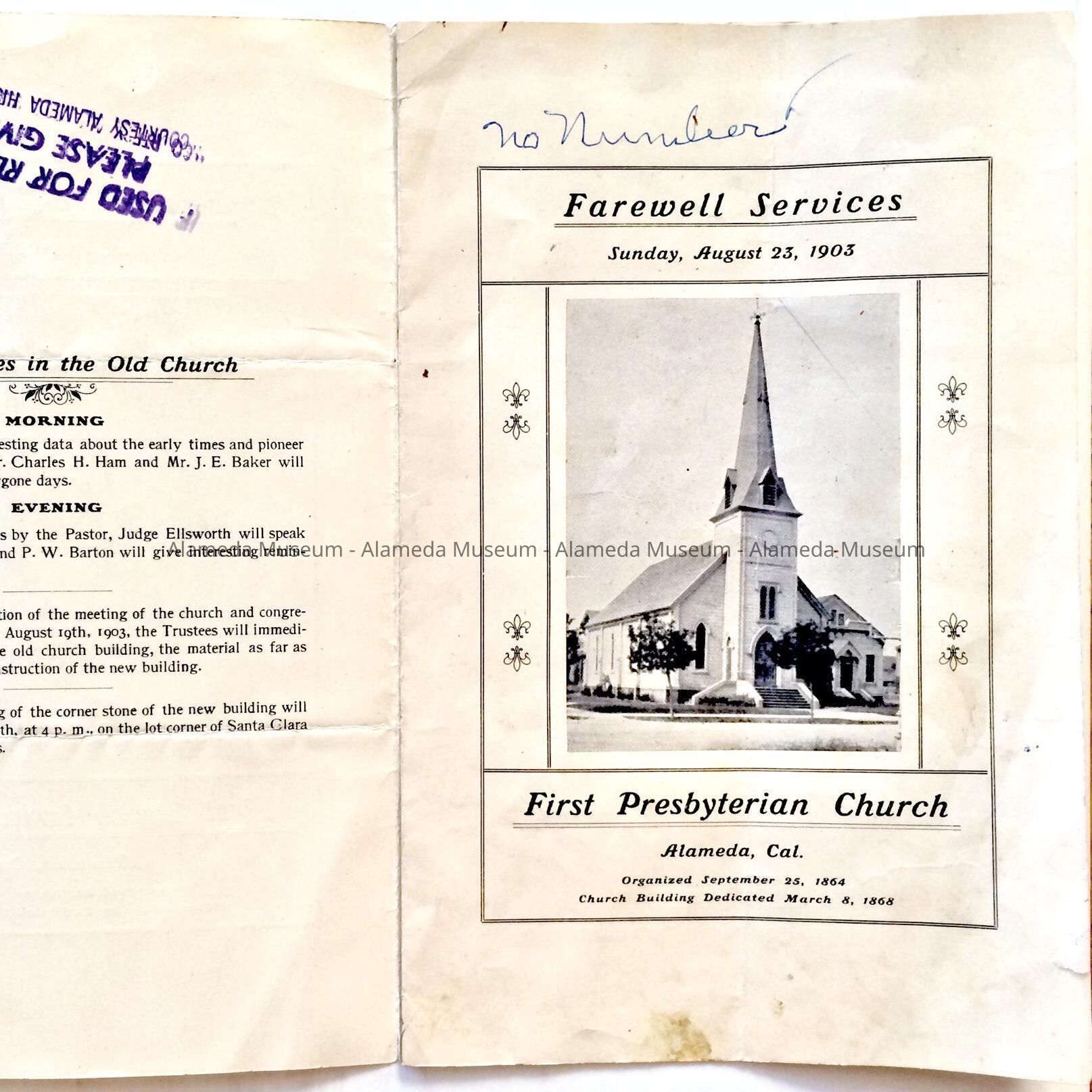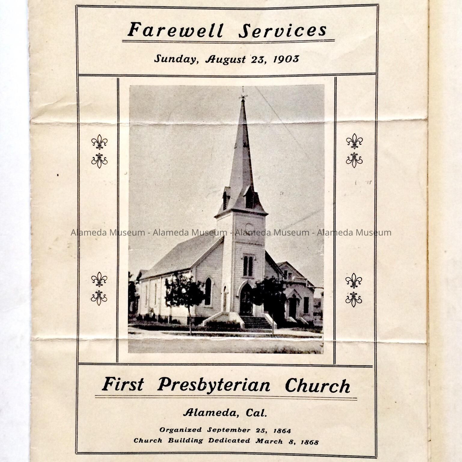 History: Program for the farewell services Sunday August 23, 1903 for the First Presbyterian Church at this time the original church structure as illustrated on the cover dedicated in 1868 was abandoned and the congregation moved to the new church edifice at the corner of Santa Clara Avenue and Chestnut Street.
