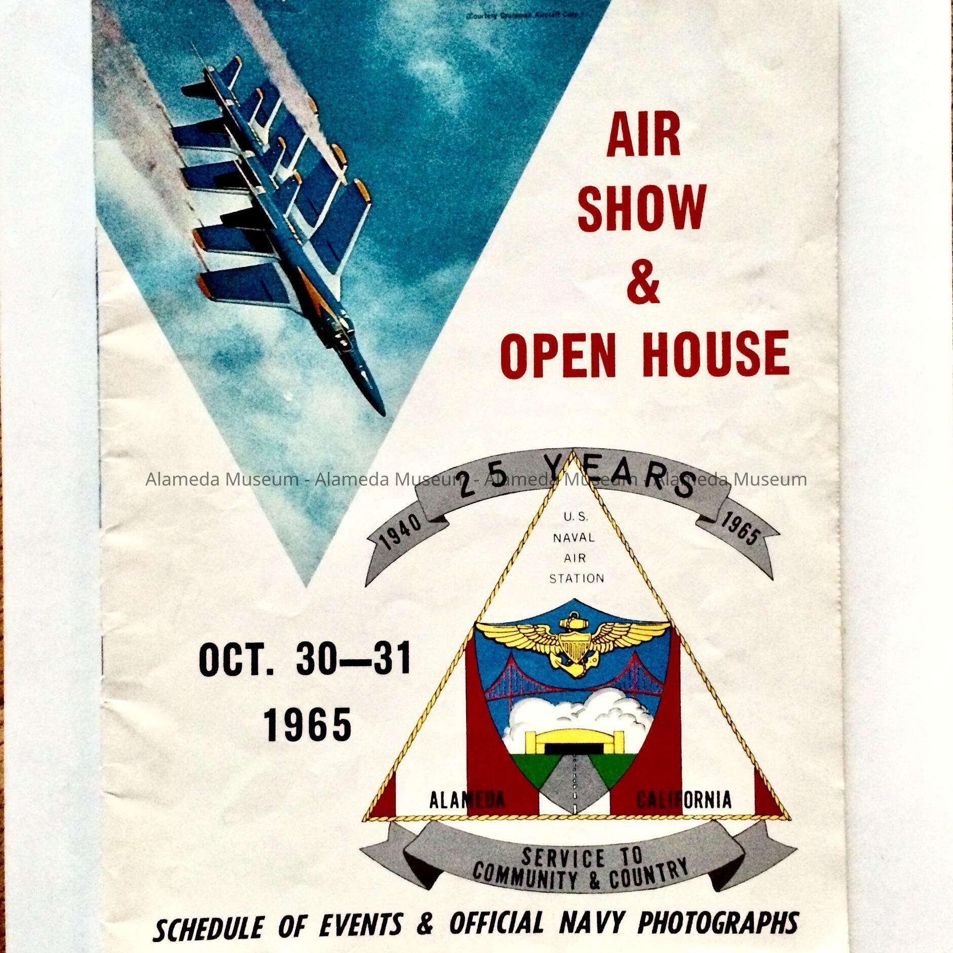 History of Object: A program for an air show and open house held on Oct. 30 and 31, 1965. Its contents have scenes of the base and its related activities, plus many display ads for local Alameda businesses.