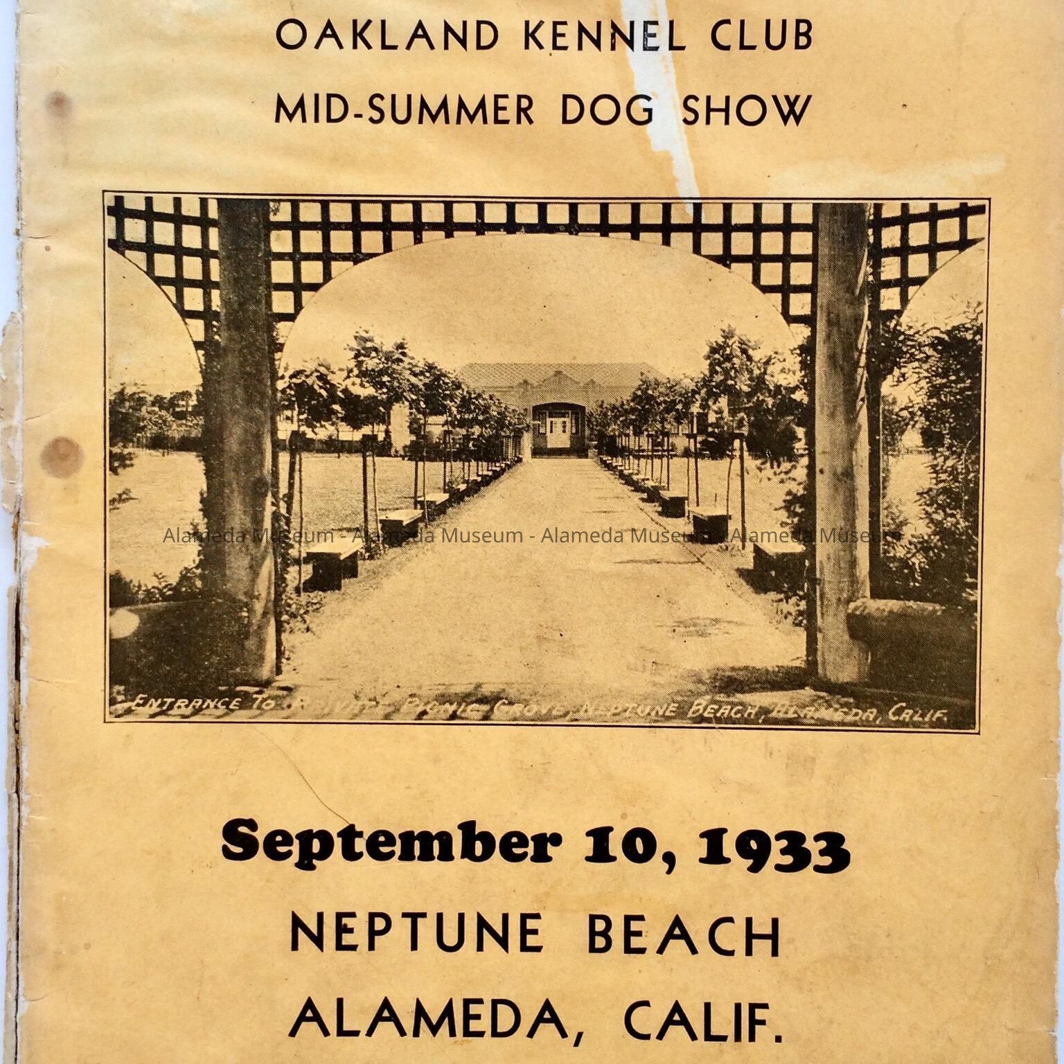 History of Object: Program booklet for Oakland Kennel Club held at Neptune Beach , February 10, 1933. Cover has an illustration of the picnic grounds at the beach.