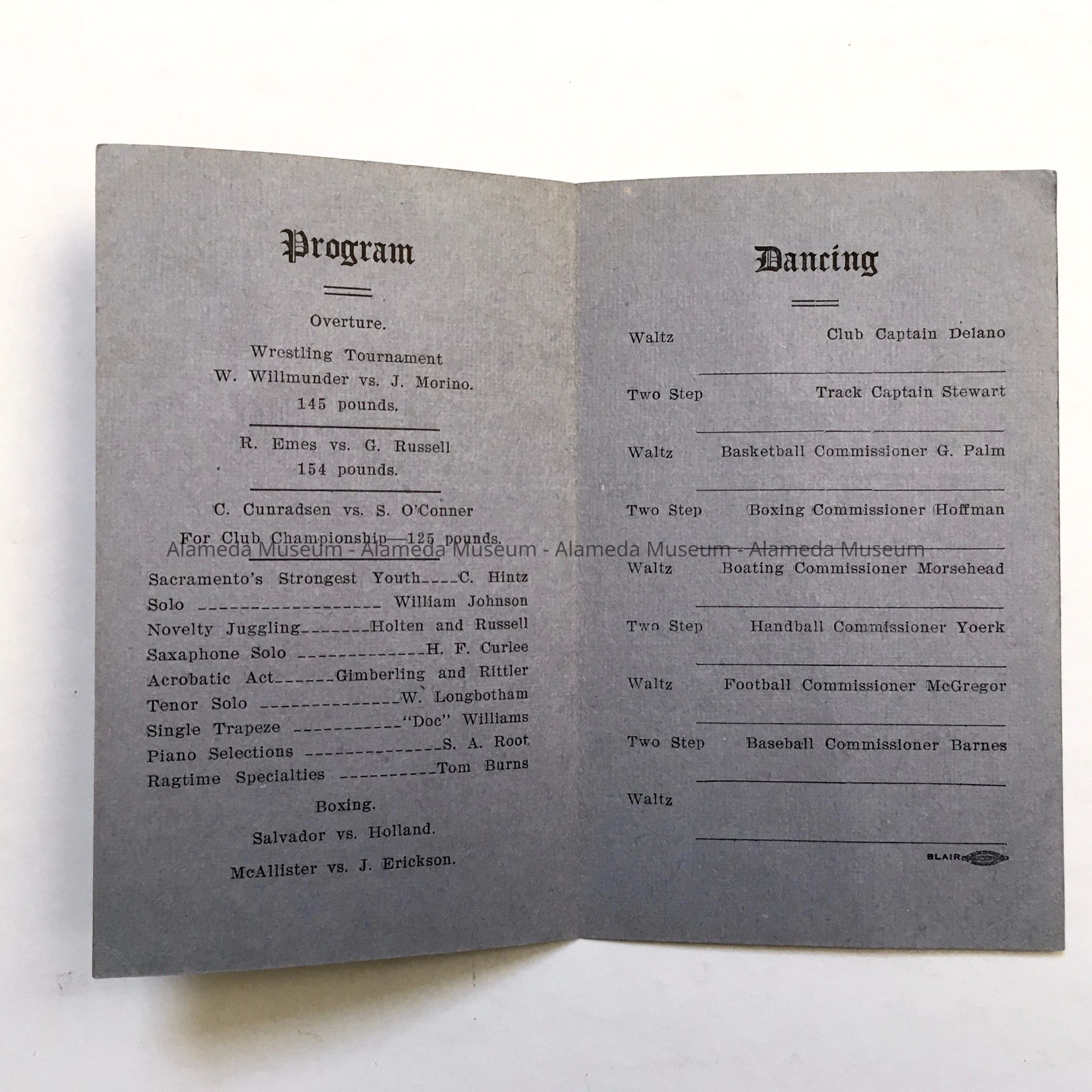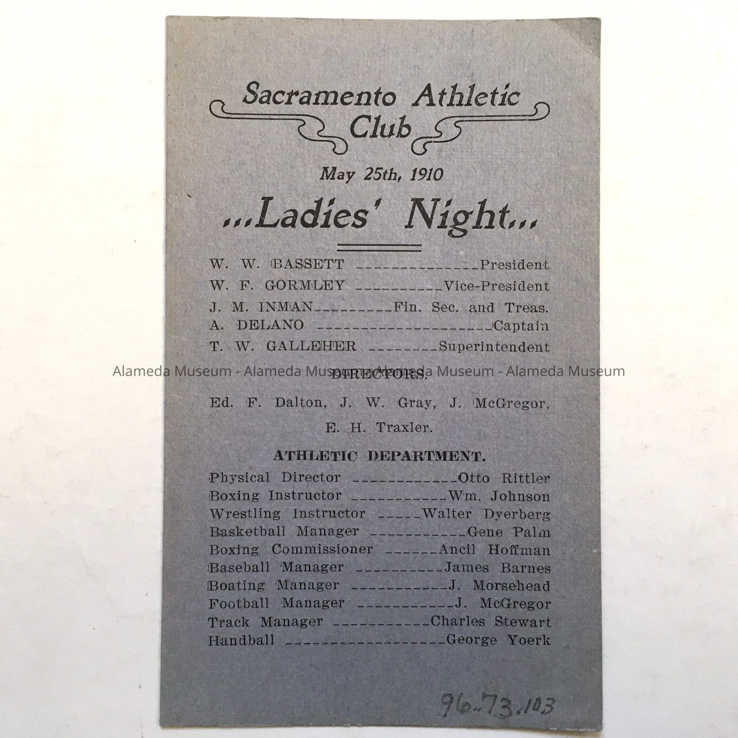 A PROGRAM PRINTED ON A DANCE CARD FOR THE SACRAMENTO ATHLETIC CLUB, SCHEDULED FOR MAY 25, 1910. OTTO RITTLER PARTICIPATED IN AN ACROBATIC ACT AS PART OF THE ENTERTAINMENT.