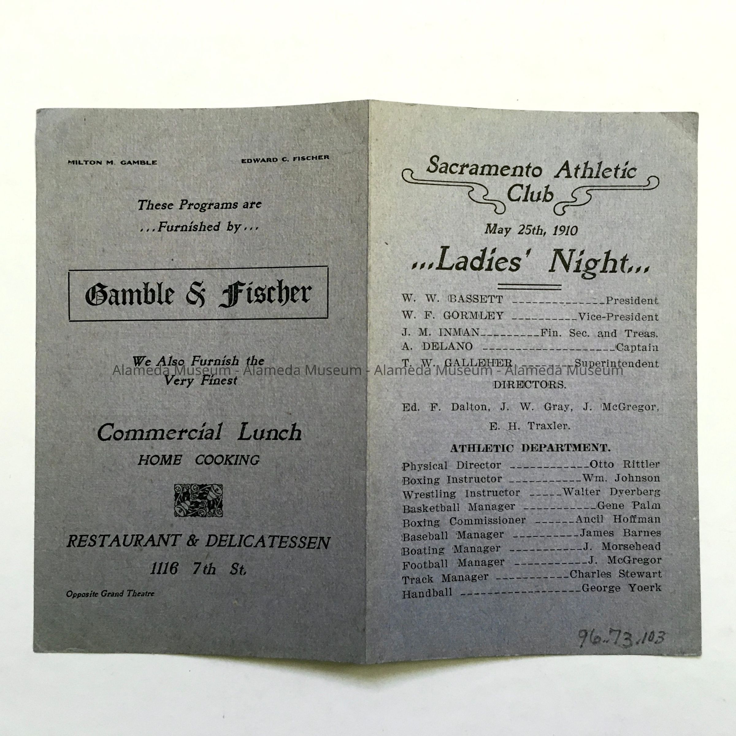 Program for Sacramento Athletic Club, with Otto Rittler participating in Acrobatic Act, 1910Entry/Object ID