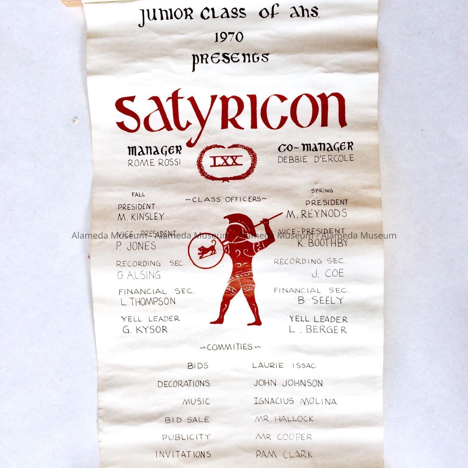 Description: rolled up paper, the ends glued to untreated wooden dowels with smoothed ends, printed in Black and Red, titled ' Junior Class of ahs 1970 presents Satyricon LXX; Feb, 20. 1970. illustrated in red with a picture of a helmeted Greek warrior with spear and shield.
