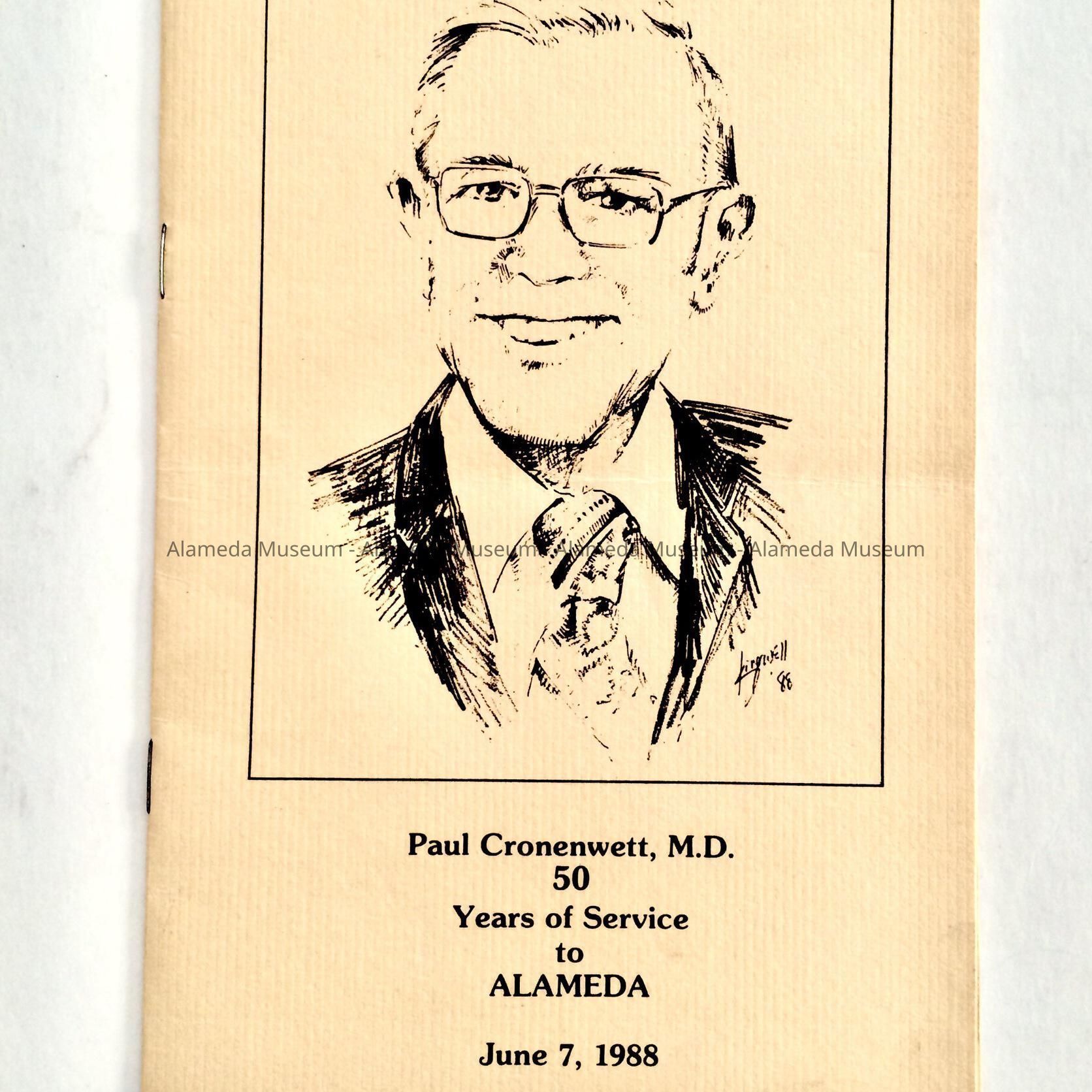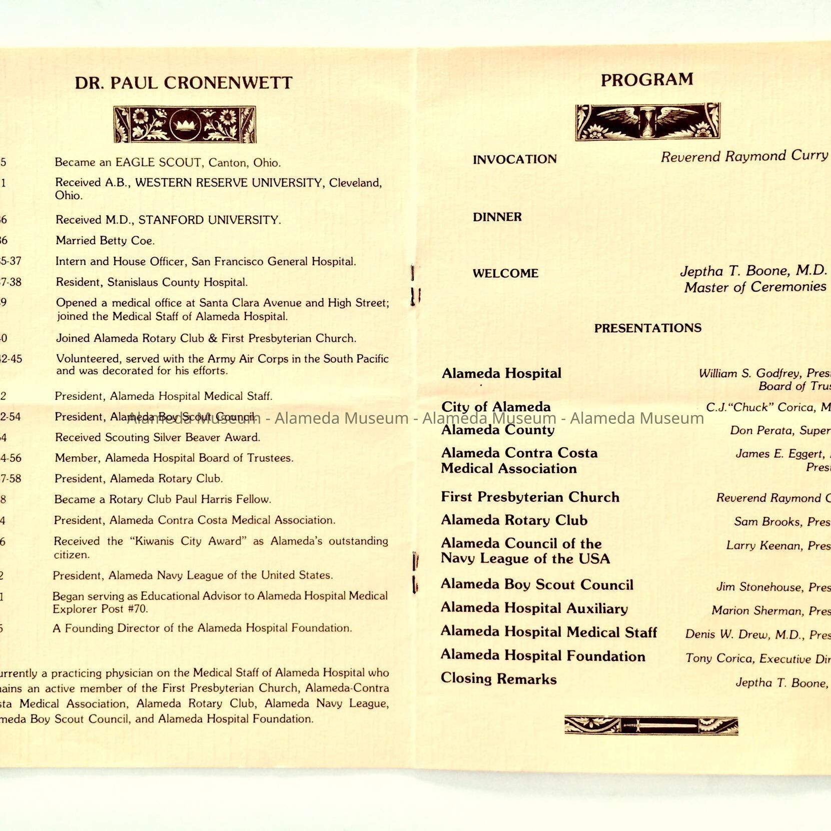 A PROGRAM FOR A TESTIMONIAL DINNER HELD FOR THE LATE DR PAUL CRONENWETT. PROGRAM INCLUDES A TIMELINE OF EVENTS CONCERNING THE DOCTOR'S LIFE. HE HAD OPENED A MEDICAL OFFICE ON SANTA CLARA AVENUE NEAR HIGH STREET IN 1939, AND JOINED THE STAFF OF ALAMEDA HOSPITAL WHERE HE SERVED FOR MANY YEARS.