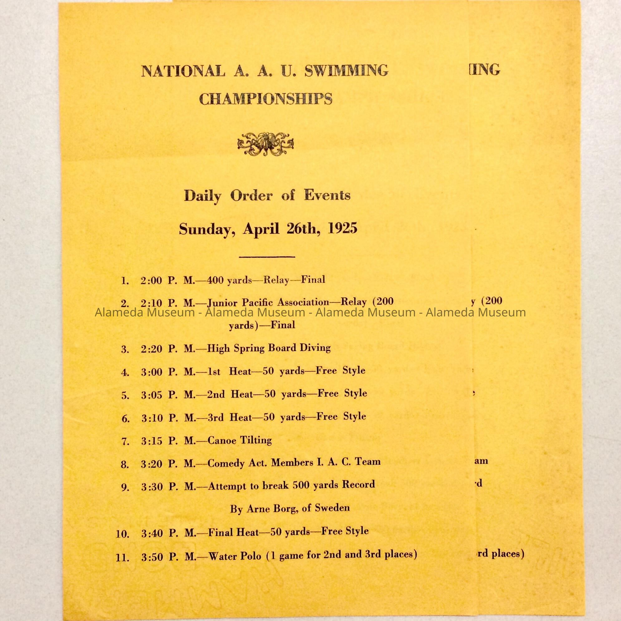 A PROGRAM ISSUED BY THE NATIONAL A.A.U. SWIMMING CHAMPIONSHIPS FOR SUNDAY, APRIL 26, 1925.