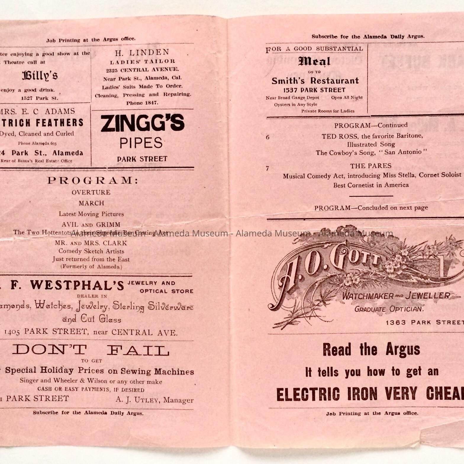 A 2-PAGE PROGRAM, WHICH INCLUDES THE PRODUCTION TITLE AND ADS FOR LOCAL BUSINESSES. COVER PAGE HAS A BOLD PRINTED CAPTION, "PARK THEATRE" IN BLACK-COLORED LETTERS ON PINK-COLORED PAPER.