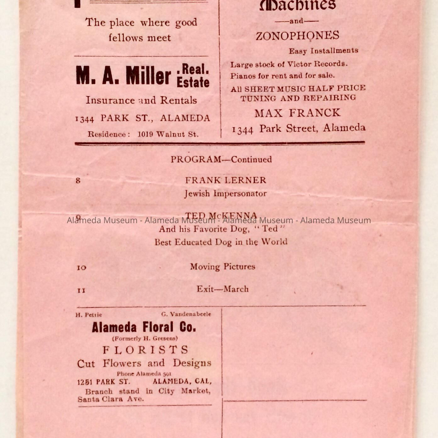 A PROGRAM FOR THE PARK THEATRE WHICH STILL STANDS AND CAN BE SEEN IN REDWOOD SQUARE. THE THEATRE IS OF BRICK CONSTRUCTION, BUILT IN THE 1900's AS A VAUDEVILLE AND MOVIE THEATRE.