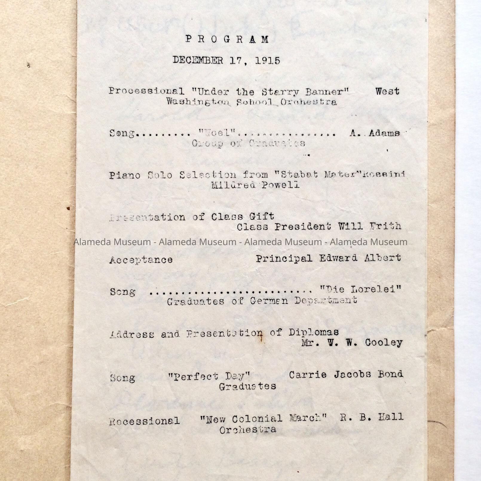 History of Object: Program, Washington School, December 17, 1915, for the graduation ceremony.