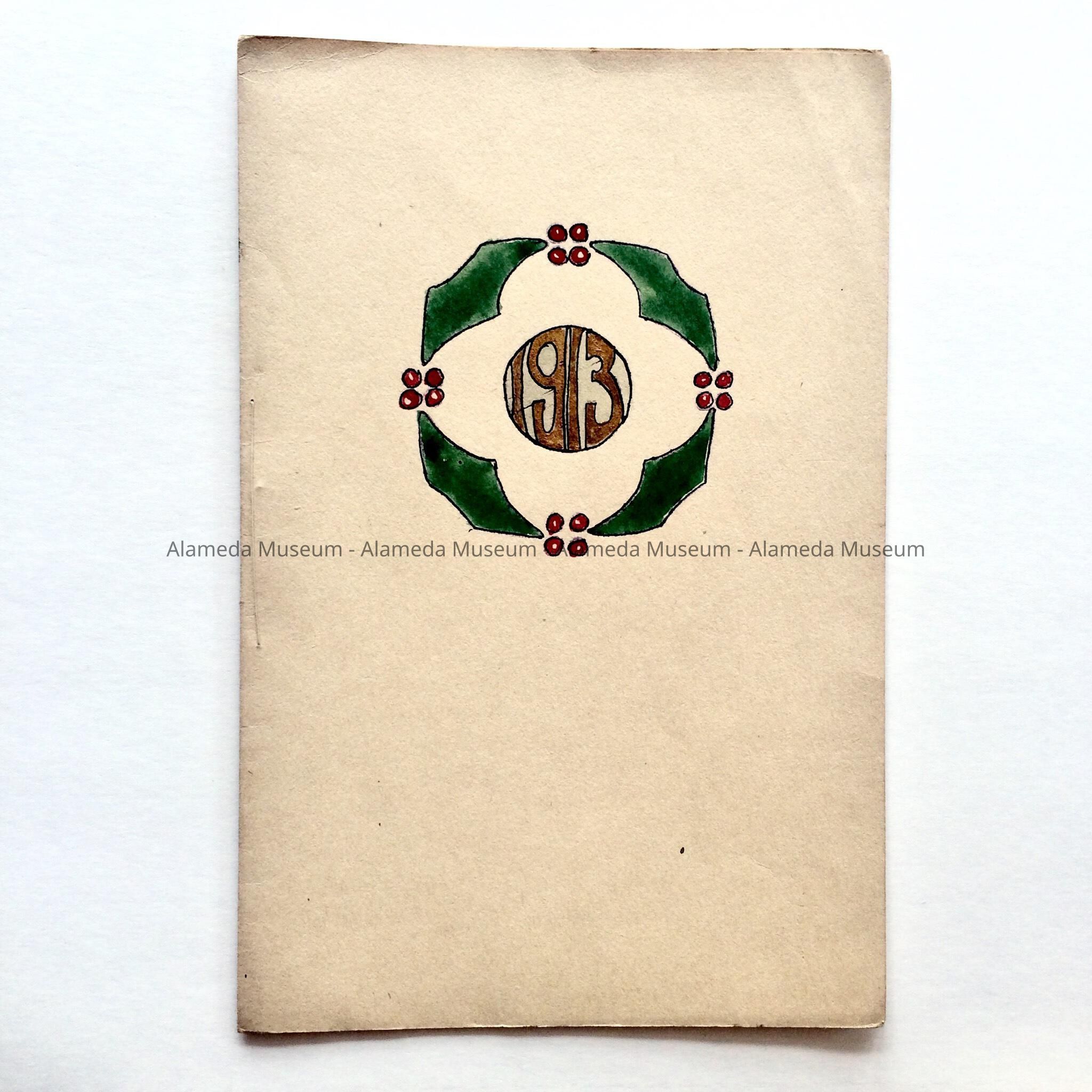 Description: Program with cover design (Christmas motif) of hand done art work (water colors) and calligraphy. Bold caption date "1913” on central cover.