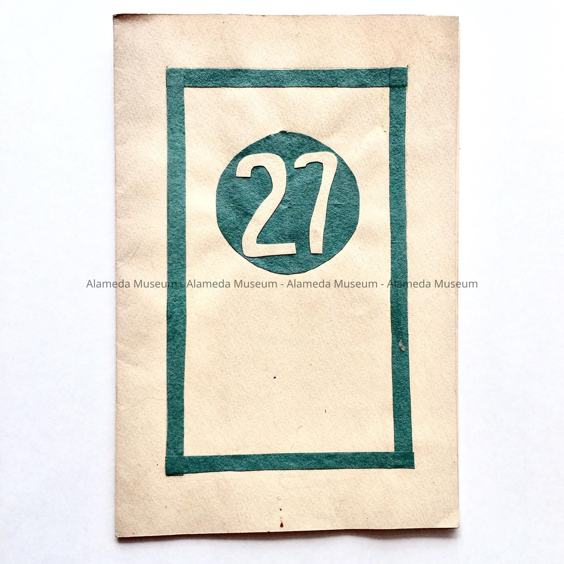 4-PAGE, SOFT-COVER BOOKLET TYPE PROGRAM. COLORED PAPER APPLIQUED TO COVER IN BLUE-COLORED PAPER, "27" WITHIN A CIRCLE.