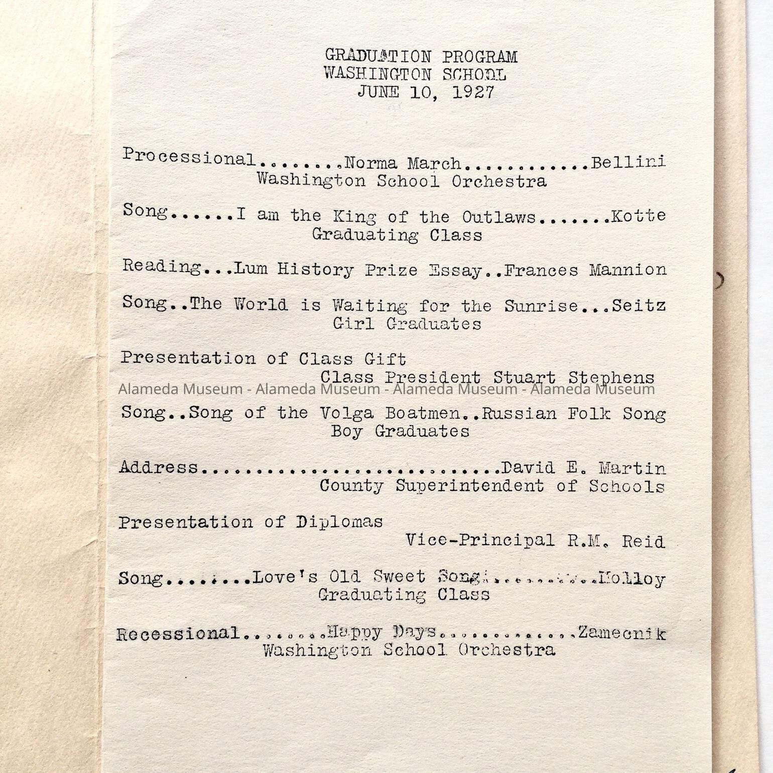 GRADUATION PROGRAM, WASHINGTON SCHOOL, ALAMEDA, CALIFORNIA, JUNE 10, 1927.