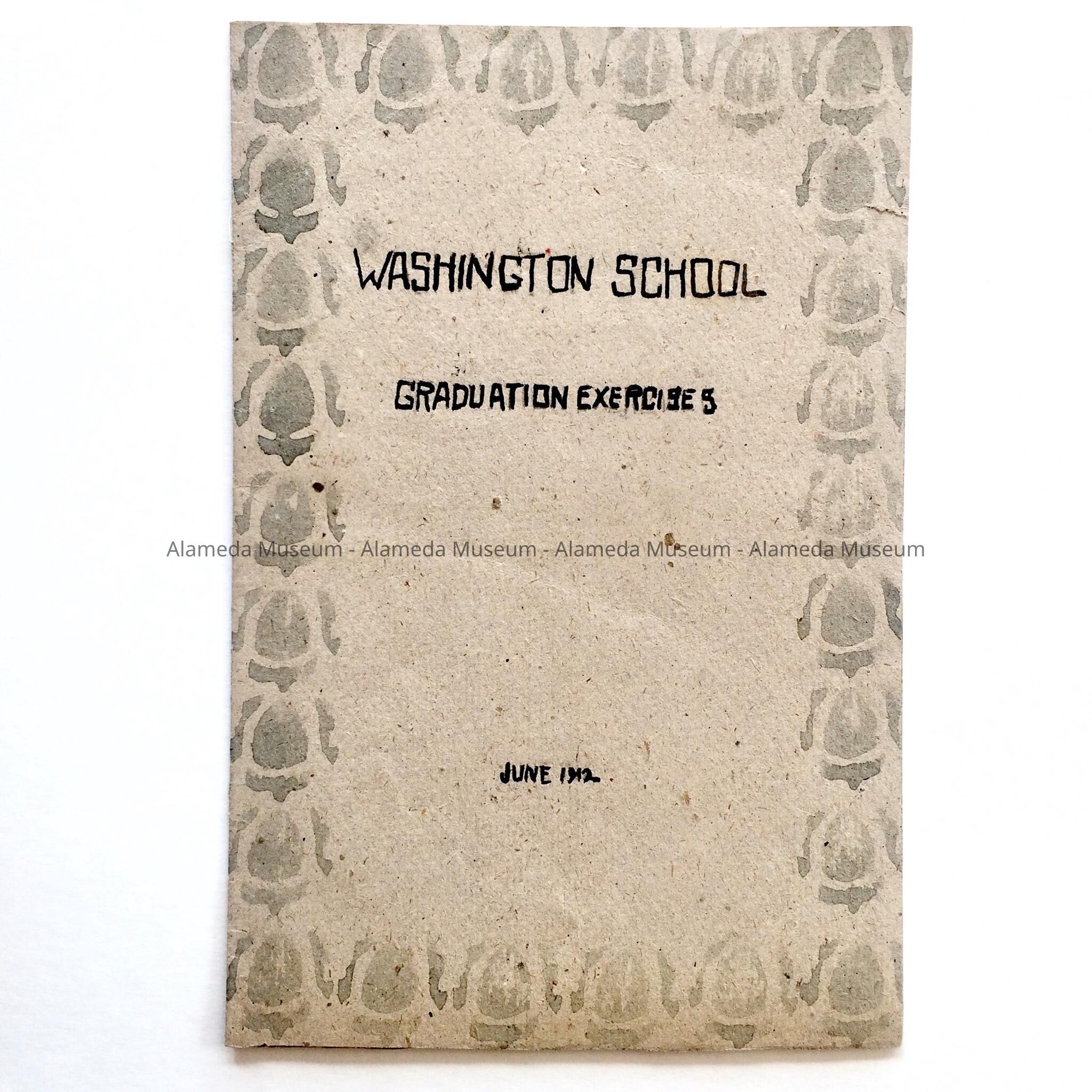 DESCRIPTION: A BOOKLET-STYLE PROGRAM. SOFT COVER HAS A STENCILED DESIGN AND A HANDWRITTEN CAPTION IN BOLD TYPE, "WASHINGTON SCHOOL GRADUATION EXERCISES," IN BLACK-COLORED INK. INTERIOR PAGE HAS BEEN MIMEOGRAPHED.