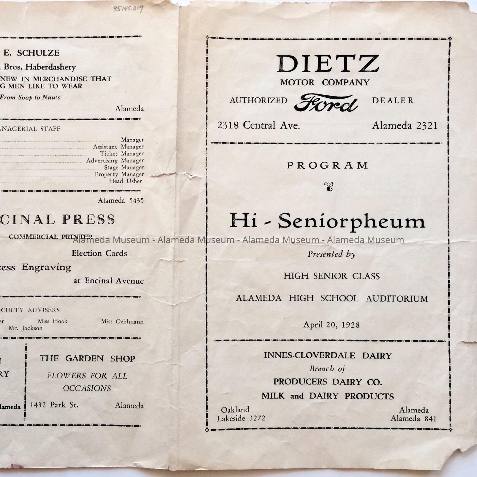 PROGRAM, HI SENIOR CLASS, ALAMEDA HIGH SCHOOL PRODUCTION, "HI SENIORPHEUM," PERFORMED ON APRIL 20, 1928. THE PROGRAM ALSO INCLUDES ADVERTISEMENTS OF LOCAL BUSINESSES OF THE PERIOD.