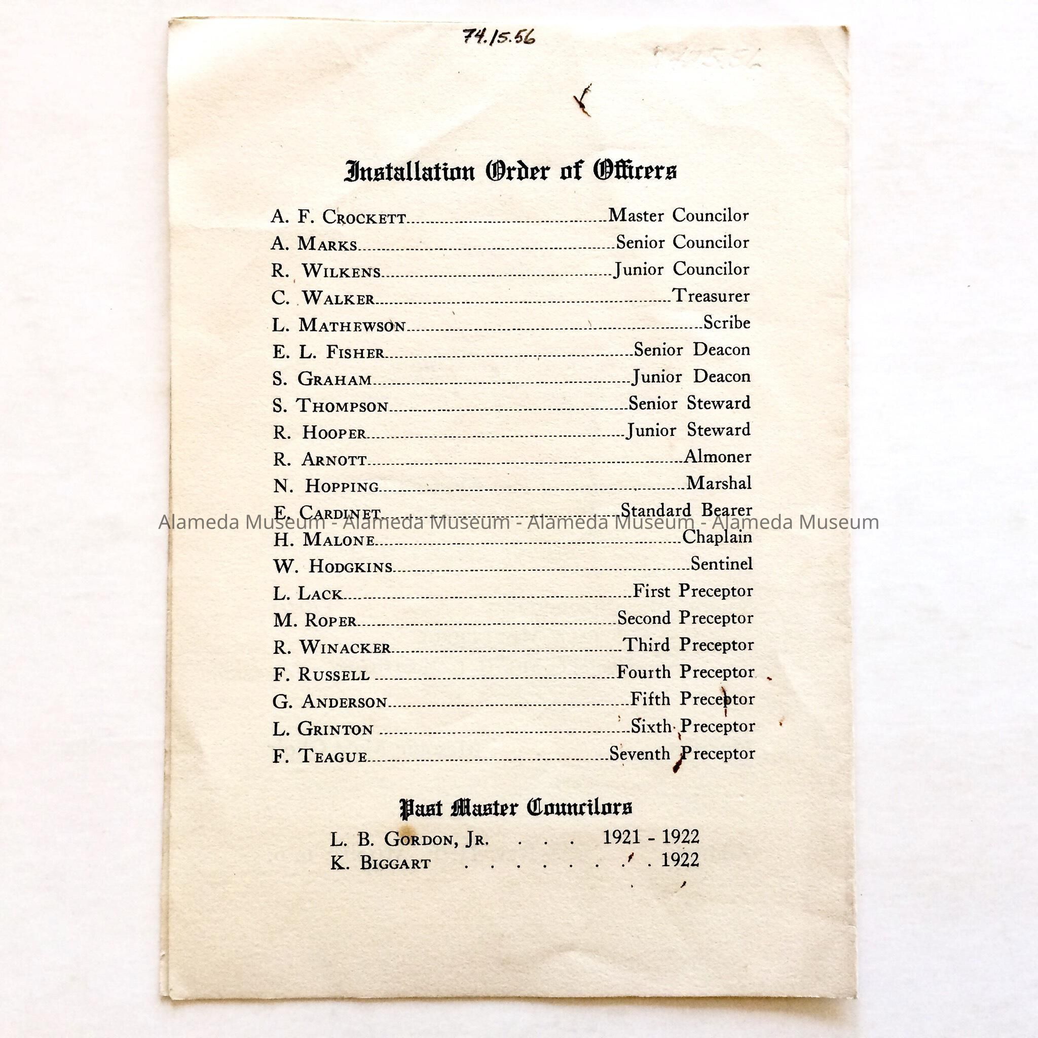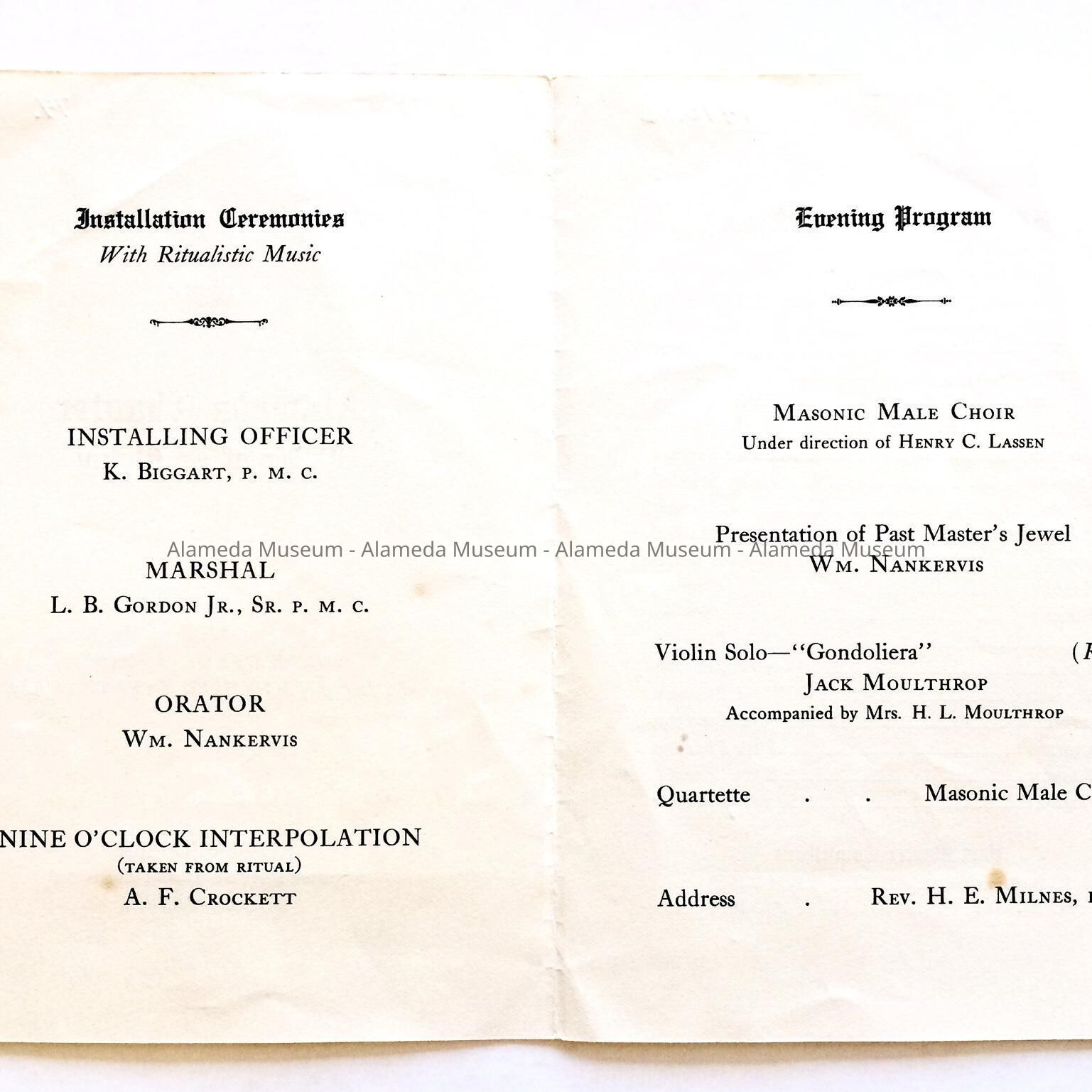 Program Installation of Officers, Alameda Chapter De Molay (Masons), 1923Entry/Object ID