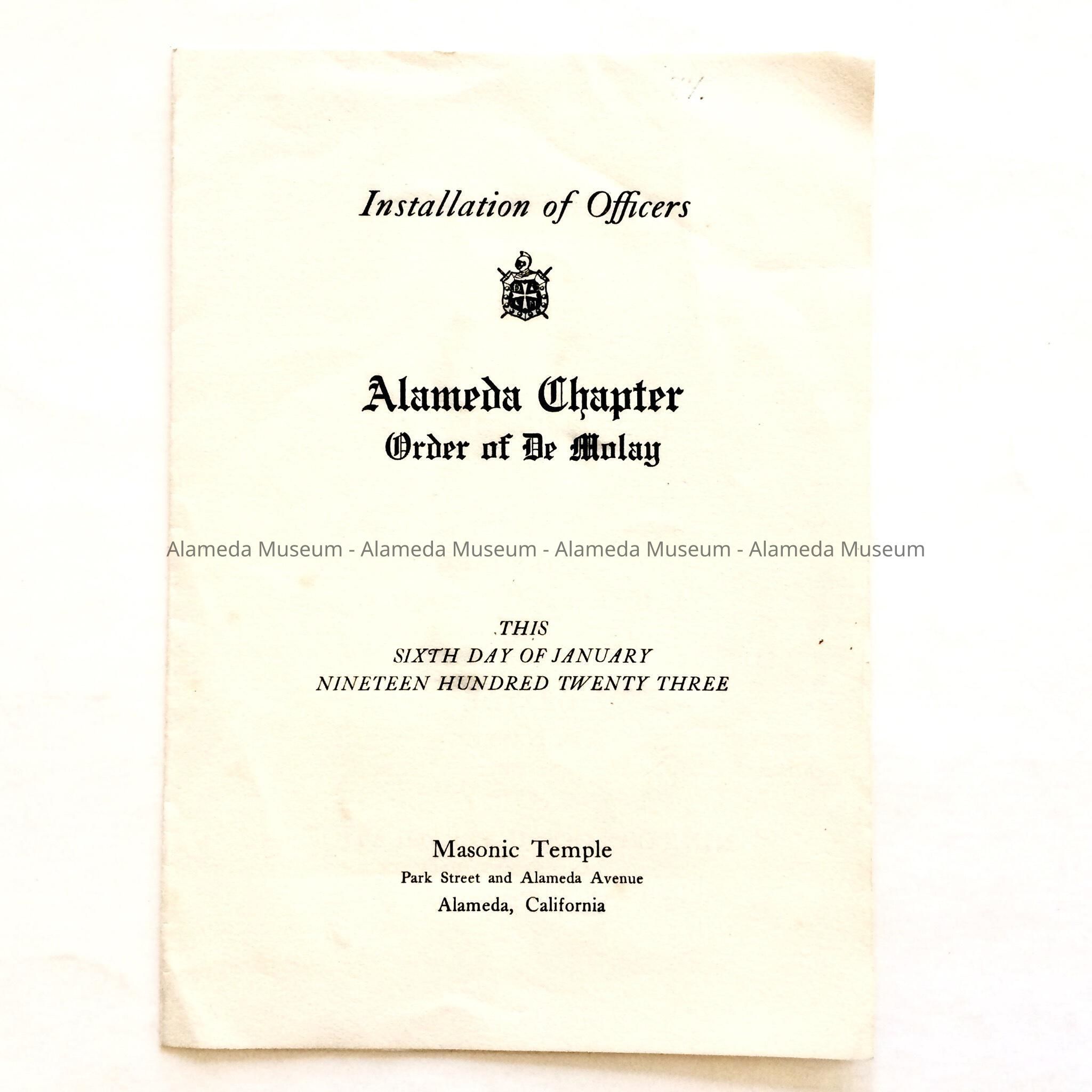 DESCRIPTION: PROGRAM, INSTALLATION OF OFFICERS, ALAMEDA CHAPTER ORDER OF DE MOLAY, JAN 6, 1923.