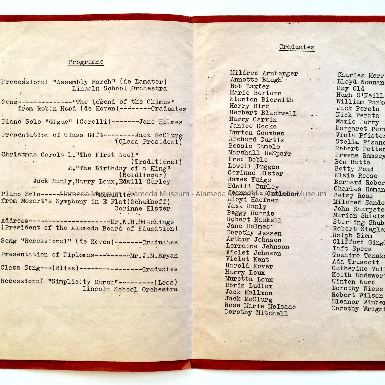 GRADUATION PROGRAM FOR LINCOLN SCHOOL, DECEMBER 16, 1932. INCLUDED AMONG THE CLASS MEMBERS WAS THE LATE JACK HANLY, HUSBAND OF THE DONOR.