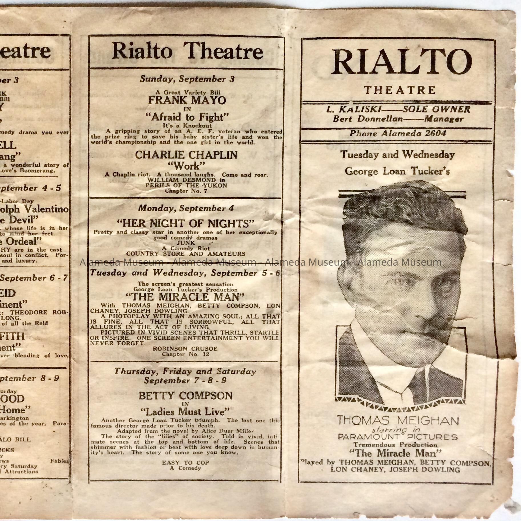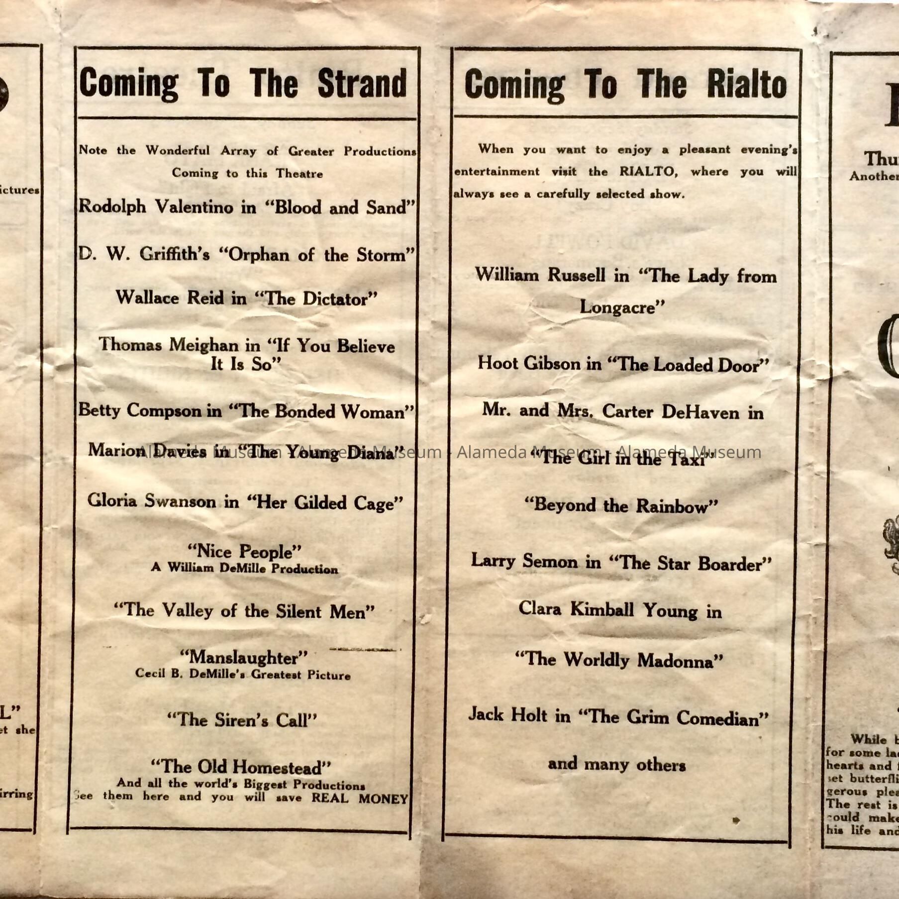 History of Object: Program of coming attractions for the Strand Theatre, which opened in 1918, located on Park Street near Encinal Avenue and the Rialto Theatre, which opened in 1921, located on the south side of Santa Clara Avenue between Park Avenue and Park Street-now Alameda Federal Savings.