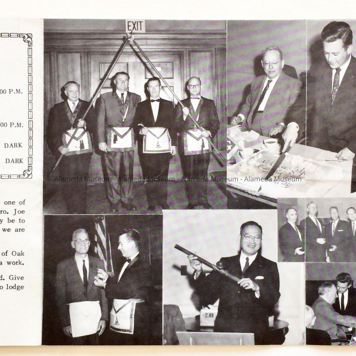 Description: Black/white illustrated pamphlet that folds into 3 sections. Cover has illustration of Masonry arch, staircase, and a bold printed caption "Oak Grove Lodge".