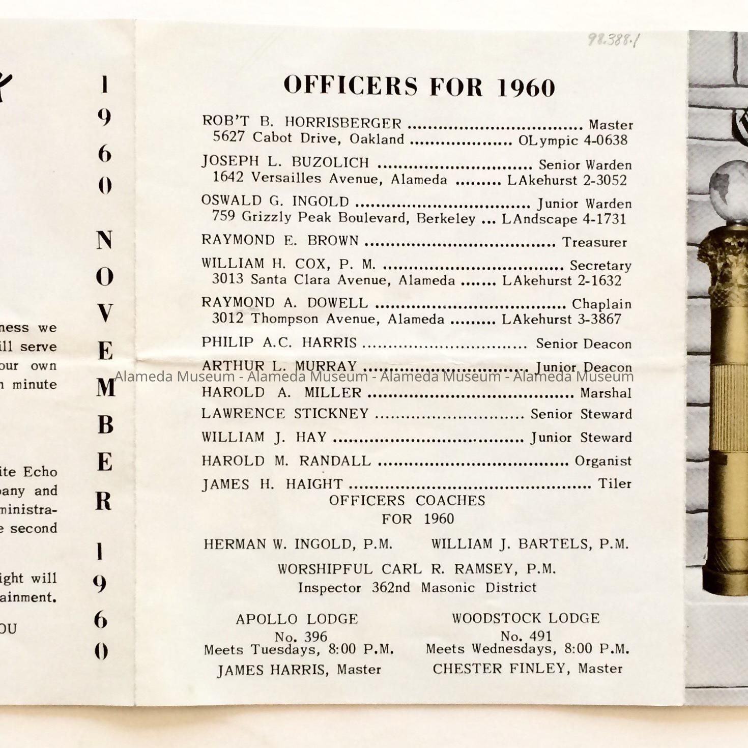 History of Object: Pamphlet announcing events for November, 1960, of the Oak Grove Lodge, Masons.