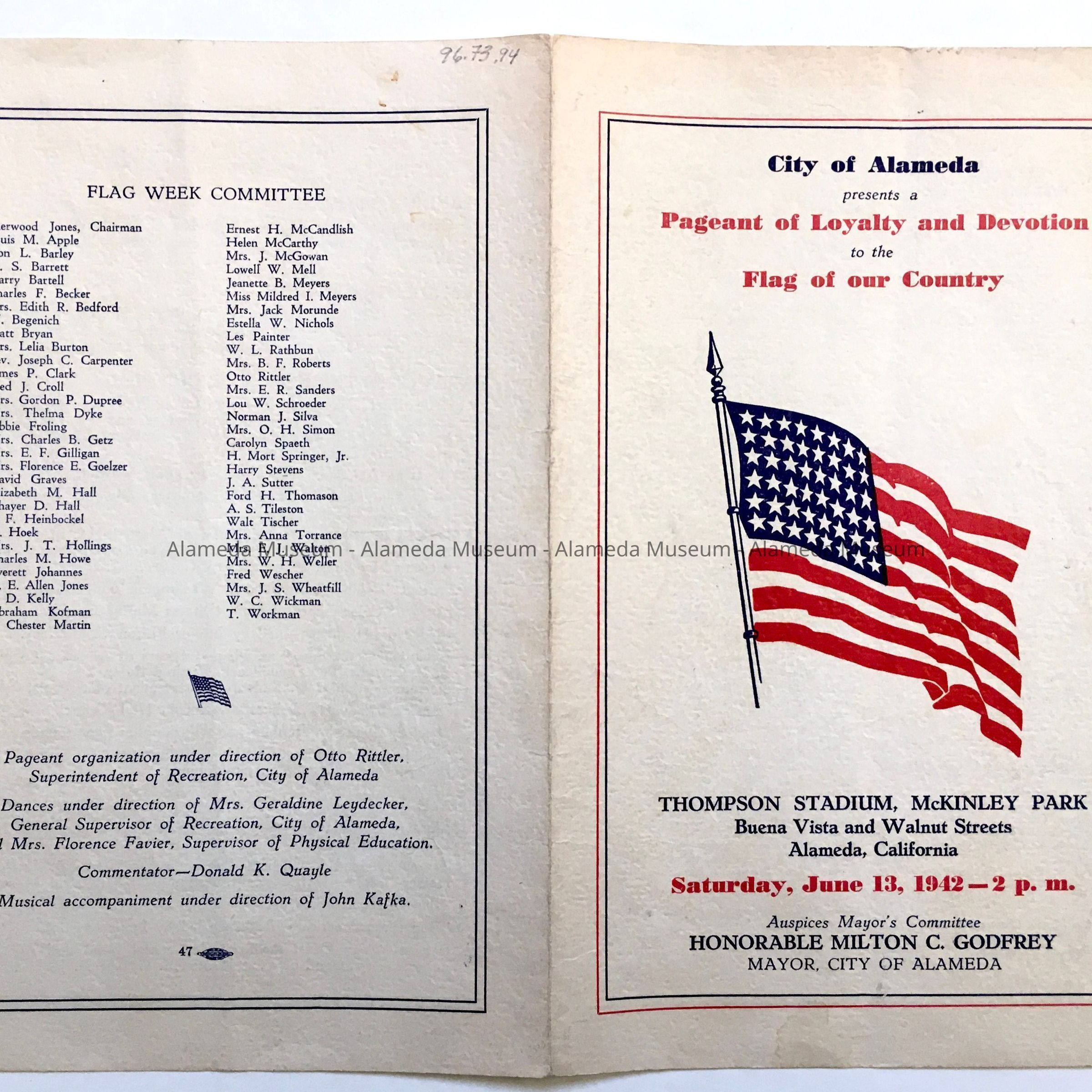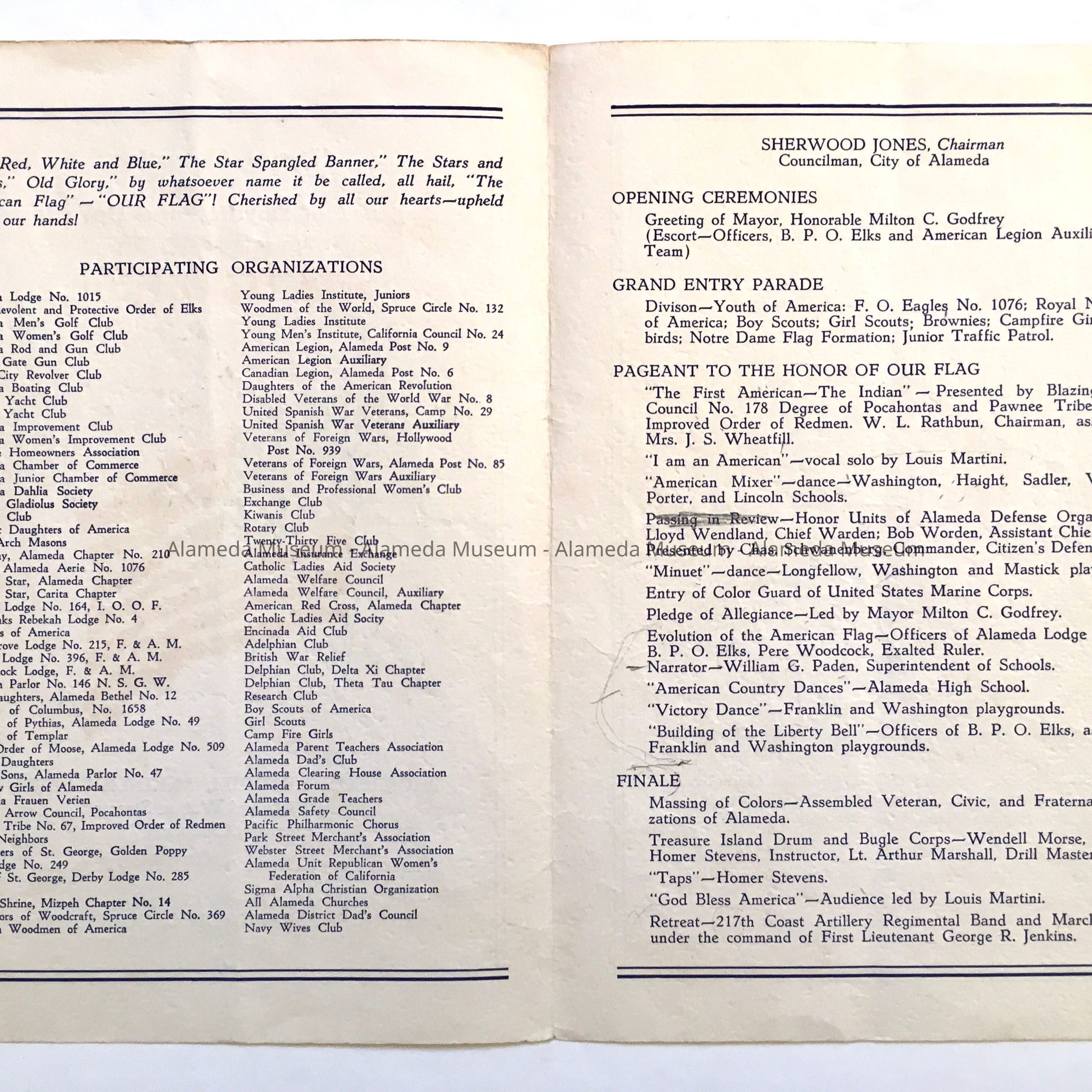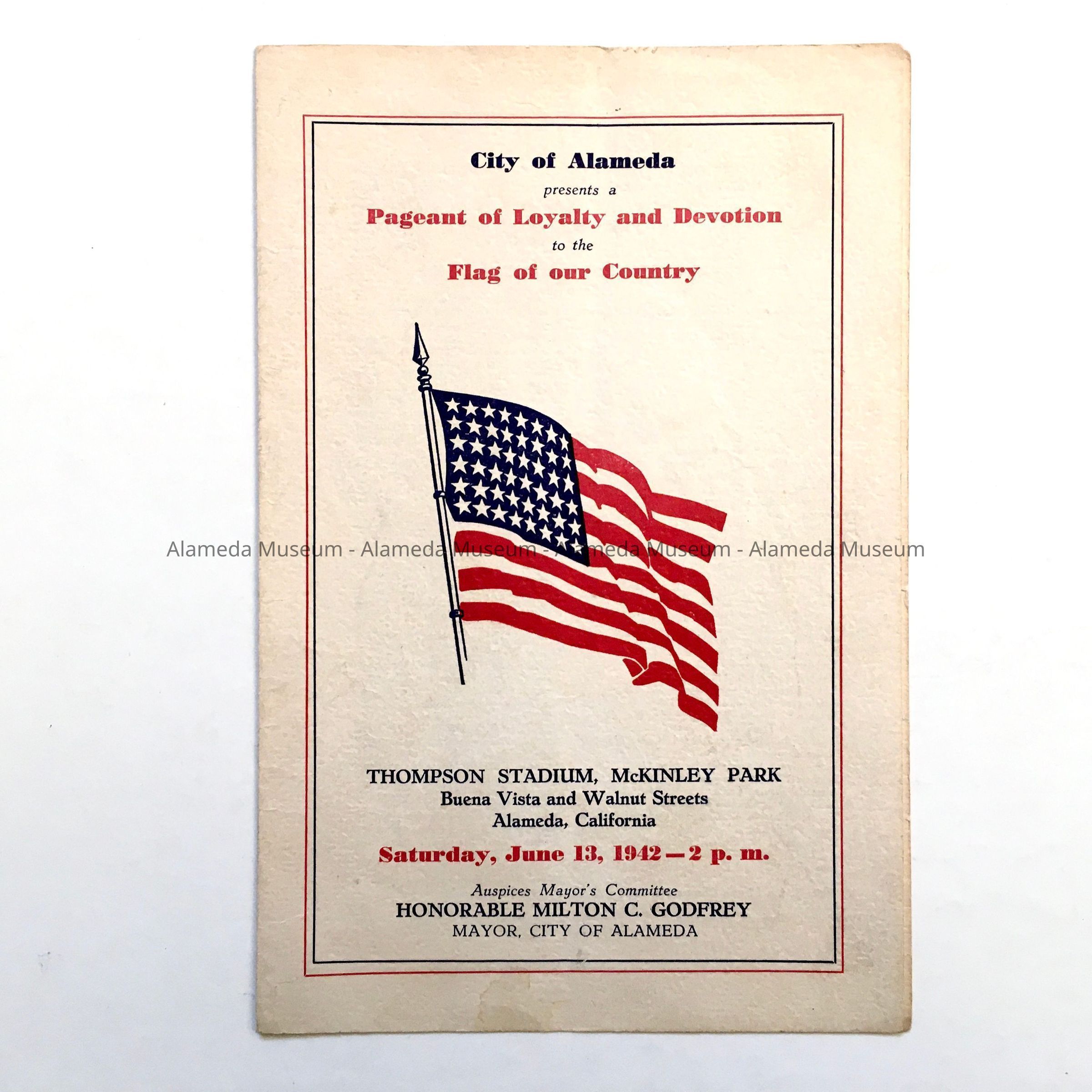A PROGRAM OF PATRIOTISM HELD AT MCKINLEY PARK ON JUNE 13, 1942 UNDER THE AUSPICES OF THE CITY OF ALAMEDA. PROGRAM INCLUDES A LIST OF ACTIVITIES AND PARTICIPANTS.