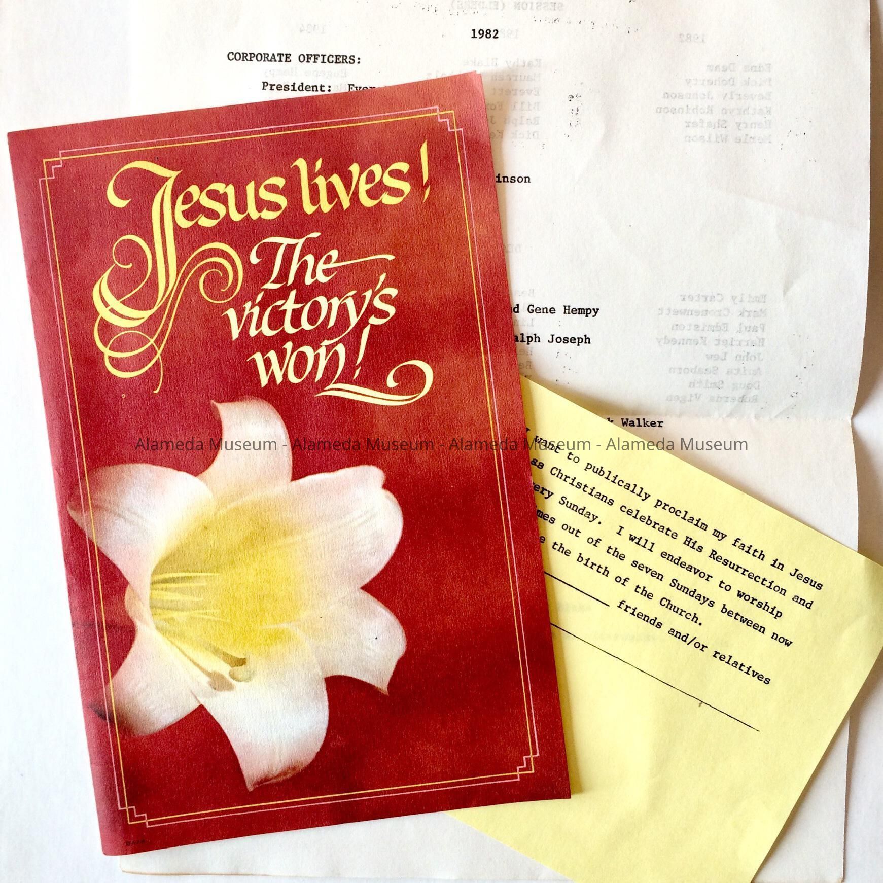 Description: 4-page program, featuring a lily on a red background, title 'Jesus lives! The victory's won!' Inside is one page listing elders and officers in 1982, 1983 and 1984; and another, on yellow paper, of a form with blanks.