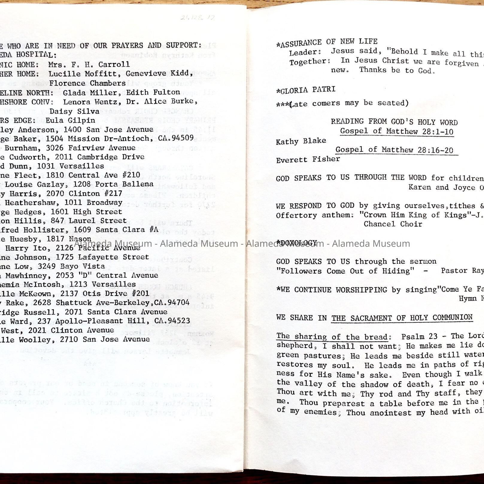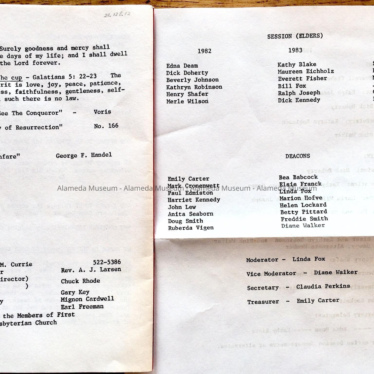 History of Object: Program for the First Presbyterian Church, 2001 Santa Clara Avenue, for April 11, 1982. Additions are a pledge form and a list of elders.