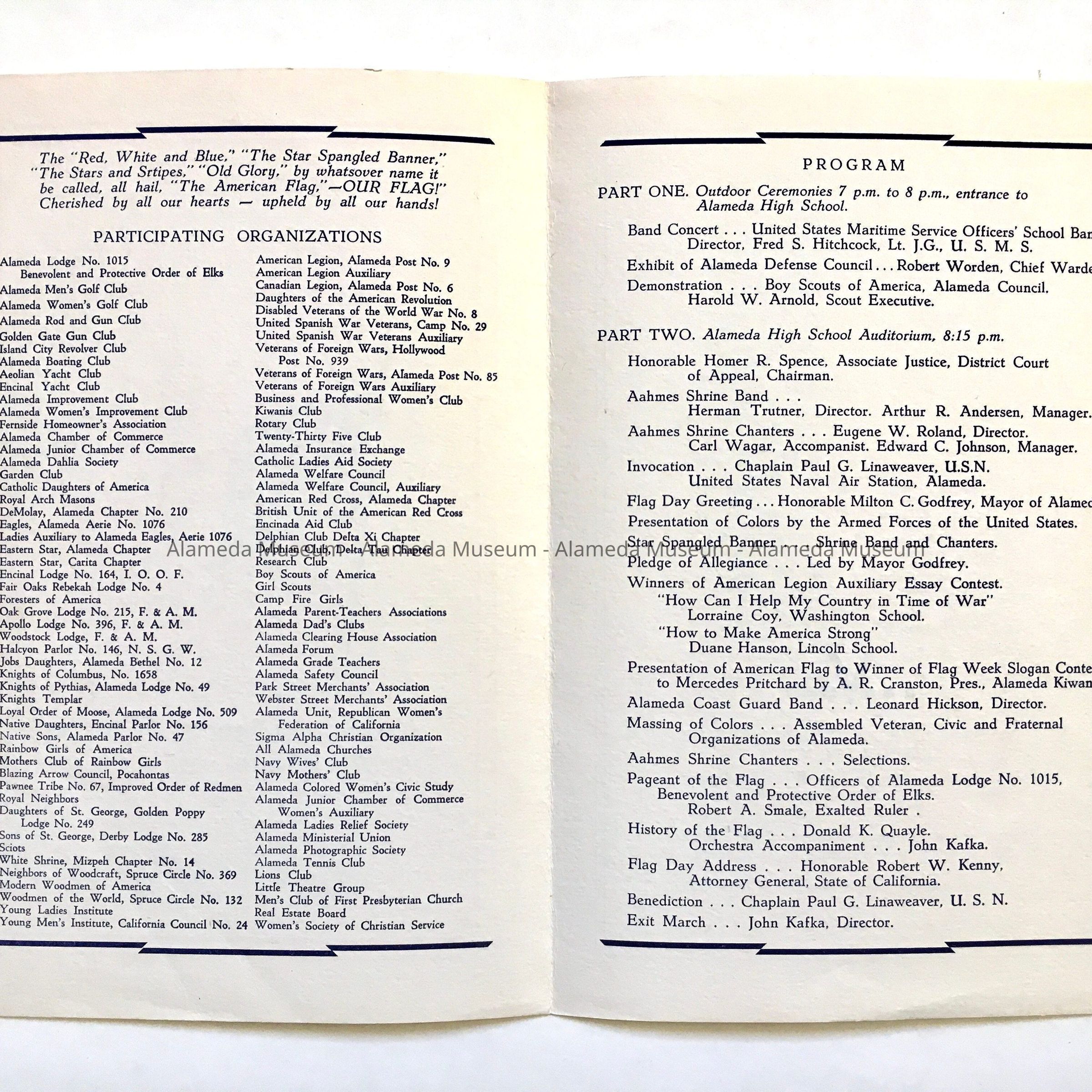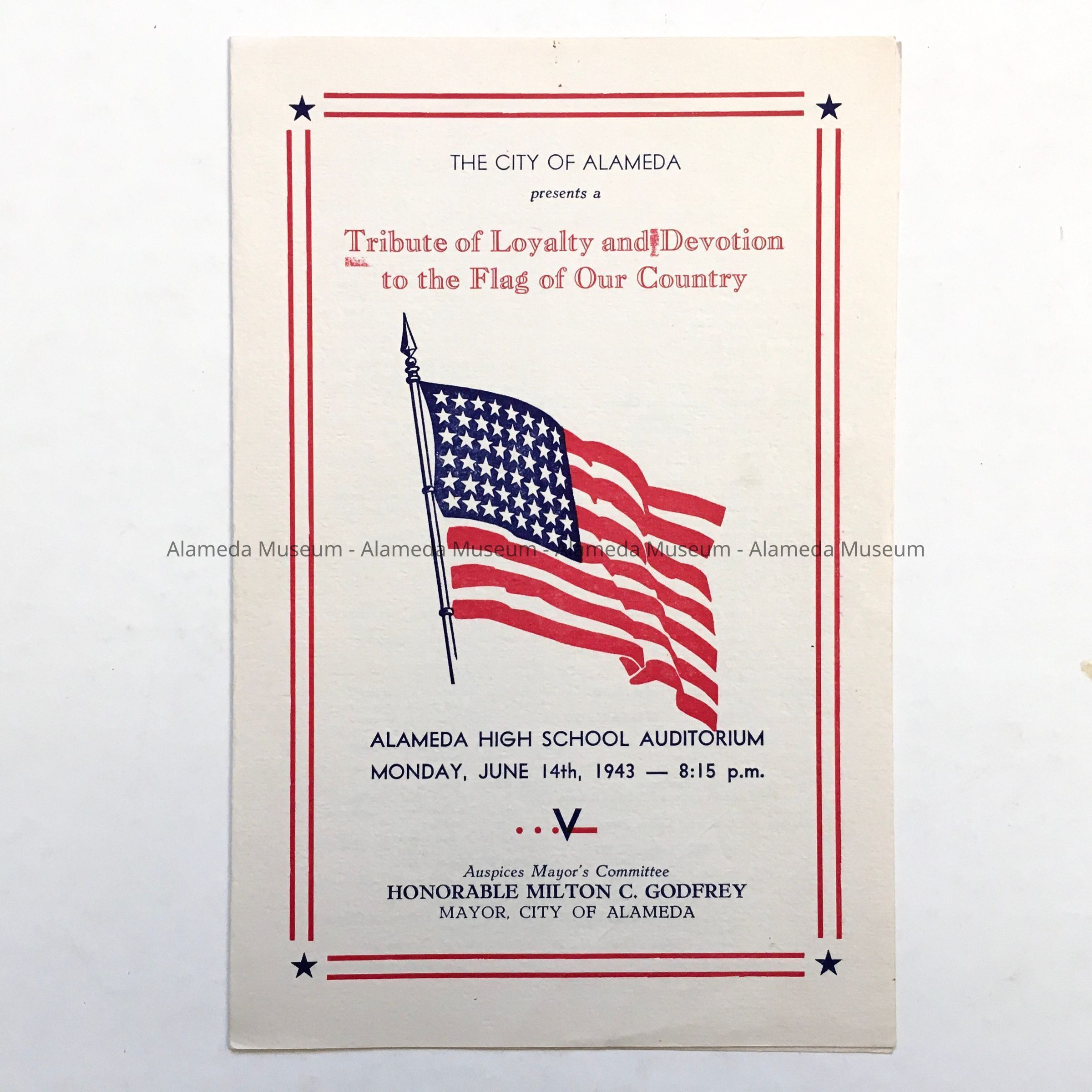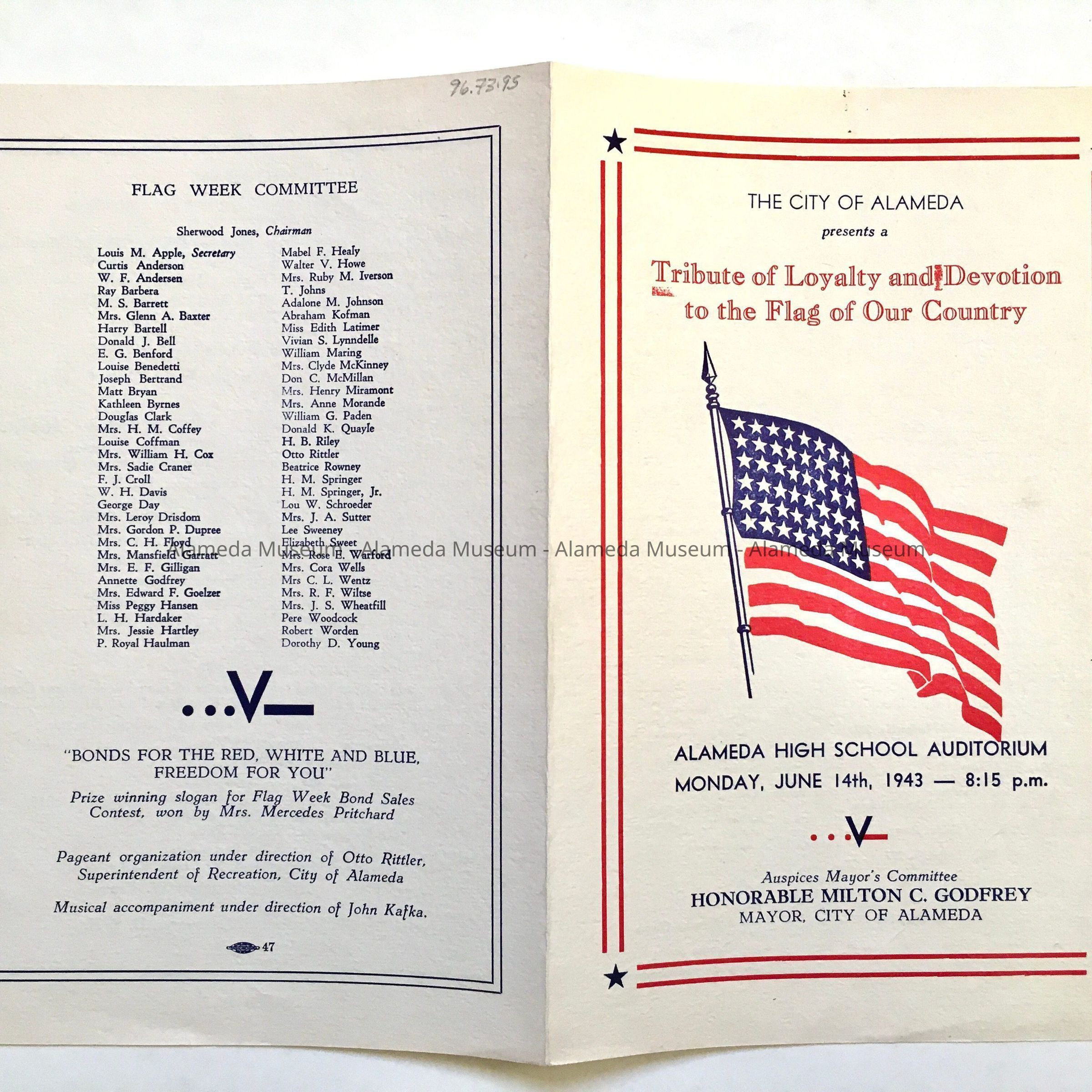 A PATRIOTIC PROGRAM HELD AT THE ALAMEDA HIGH SCHOOL AUDITORIUM ON JUNE 14, 1943. THE PROGRAM INCLUDES A LIST OF PARTICIPANTS, PROGRAM, AND COMMITTEE NAMES. OTTO RITTLER PARTICIPATED IN THE EVENT.