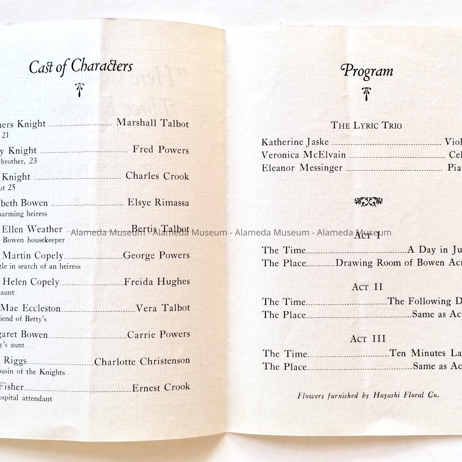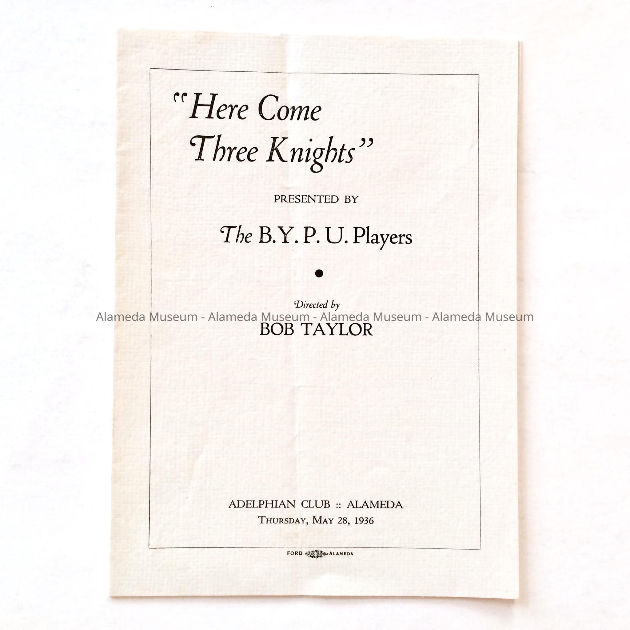 HISTORY OF OBJECT: PROGRAM FOR THE PLAY "HERE COME THREE KNIGHTS", PRESENTED BY THE B. Y. P. U. PLAYERS, ADELPHIAN CLUB, ALAMEDA, MAY 28, 1936