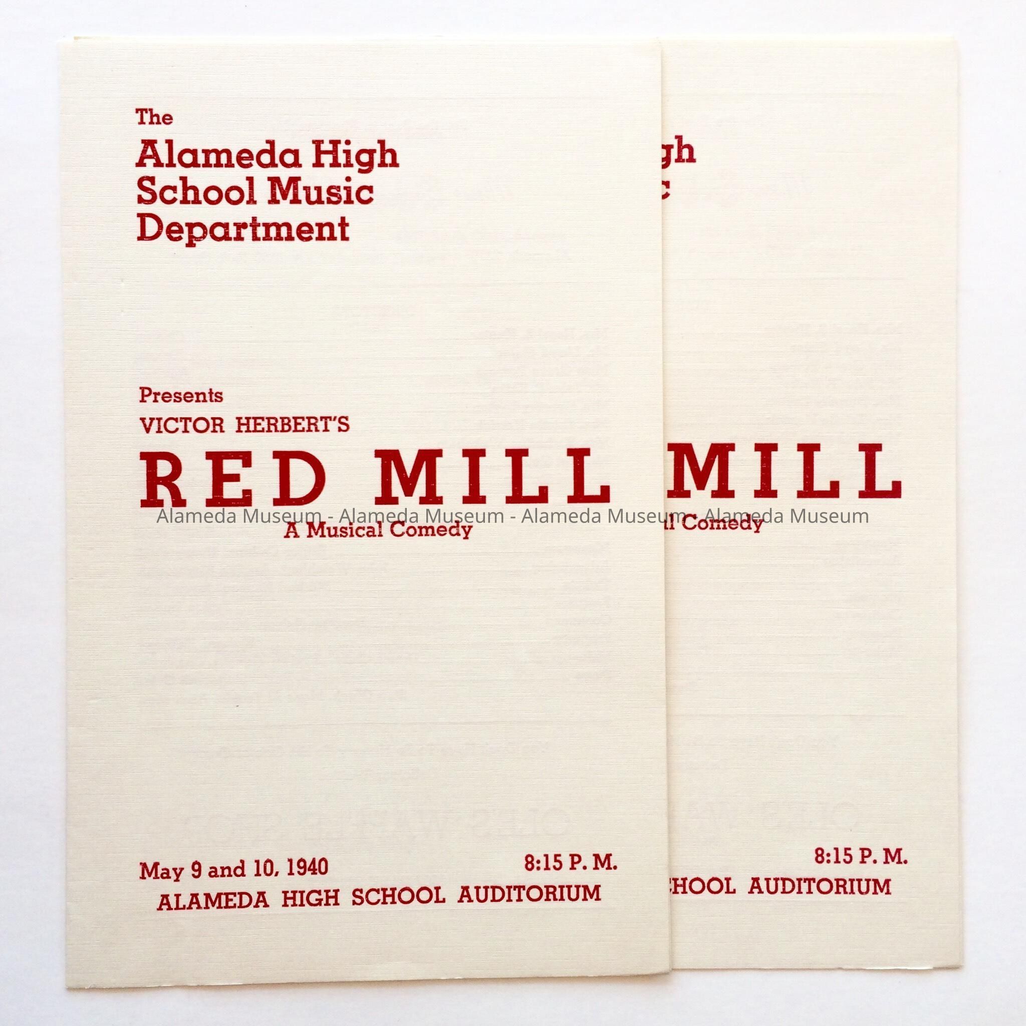 HISTORY OF OBJECT: THE ALAMEDA HIGH SCHOOL MUSIC DEPARTMENT PRESENTS VICTOR HERVERT'S "THE RED MILL", MAY 9 & 10, 1940, ALAMEDA HIGH SCHOOL AUDITORIUM. PROGRAM CONTAINS A LIST OF CAST AND STAFF.